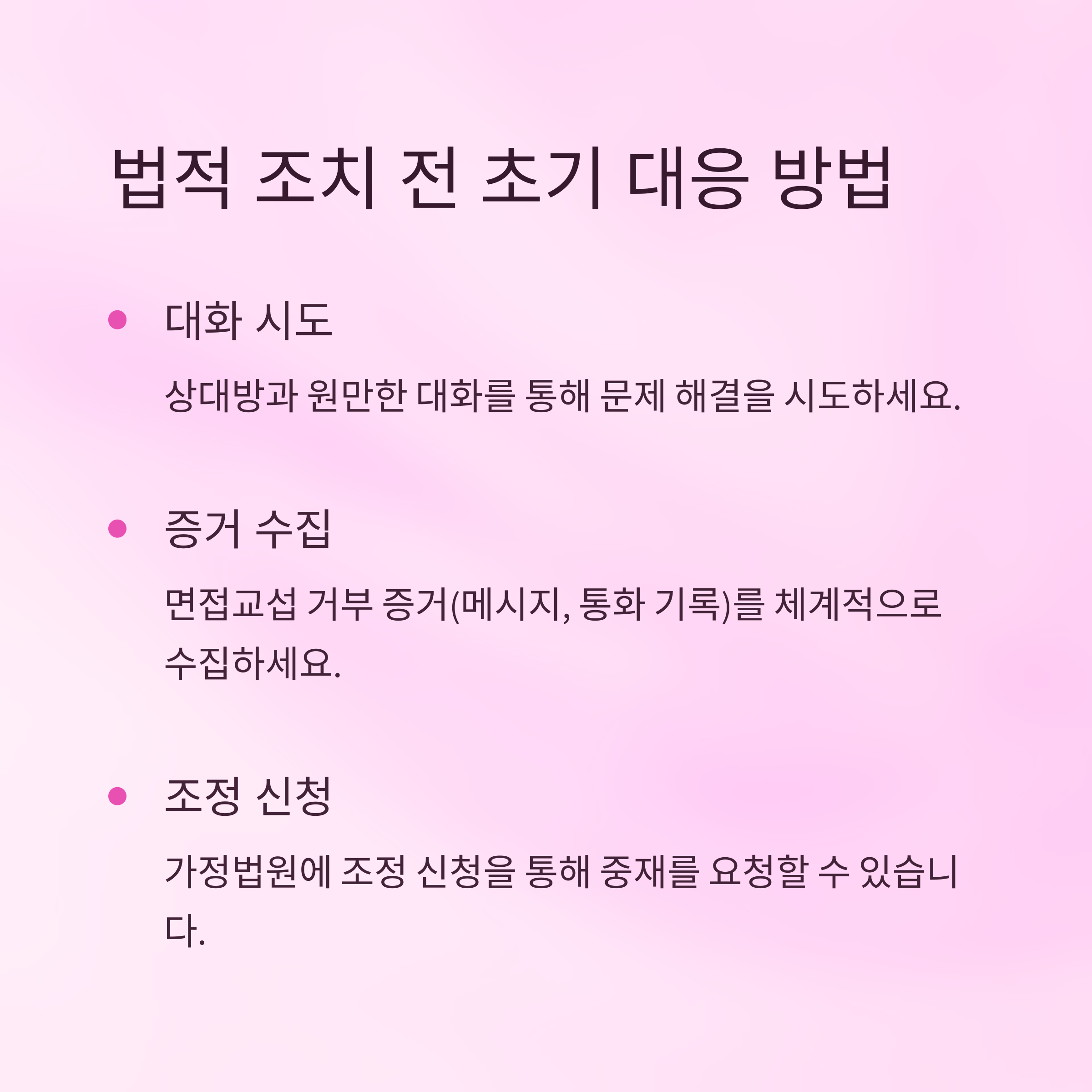 면접교섭권 거부가 발생했을 때, 무턱대고 법적 조치부터 취하기보다는 먼저 상황을 해결하려는 노력을 기록으로 남기는 것이 중요해요. 이는 나중에 법적 분쟁 시 중요한 증거 자료가 될 수 있답니다.