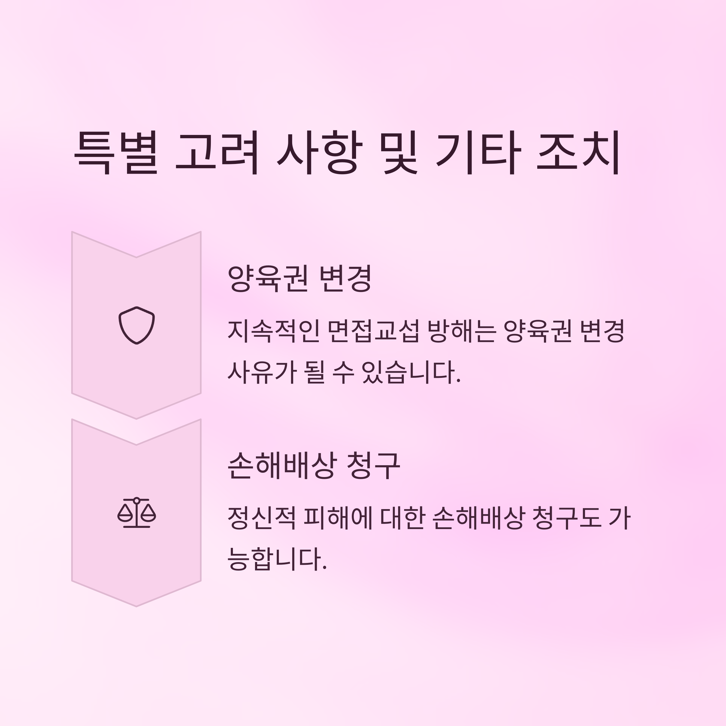 면접교섭권 거부 상황에서는 강제이행 소송 외에도 다양한 법적, 심리적 고려 사항이 있을 수 있어요. 자녀의 복리를 최우선으로 생각하며 상황에 맞는 추가적인 조치를 검토해 보세요.