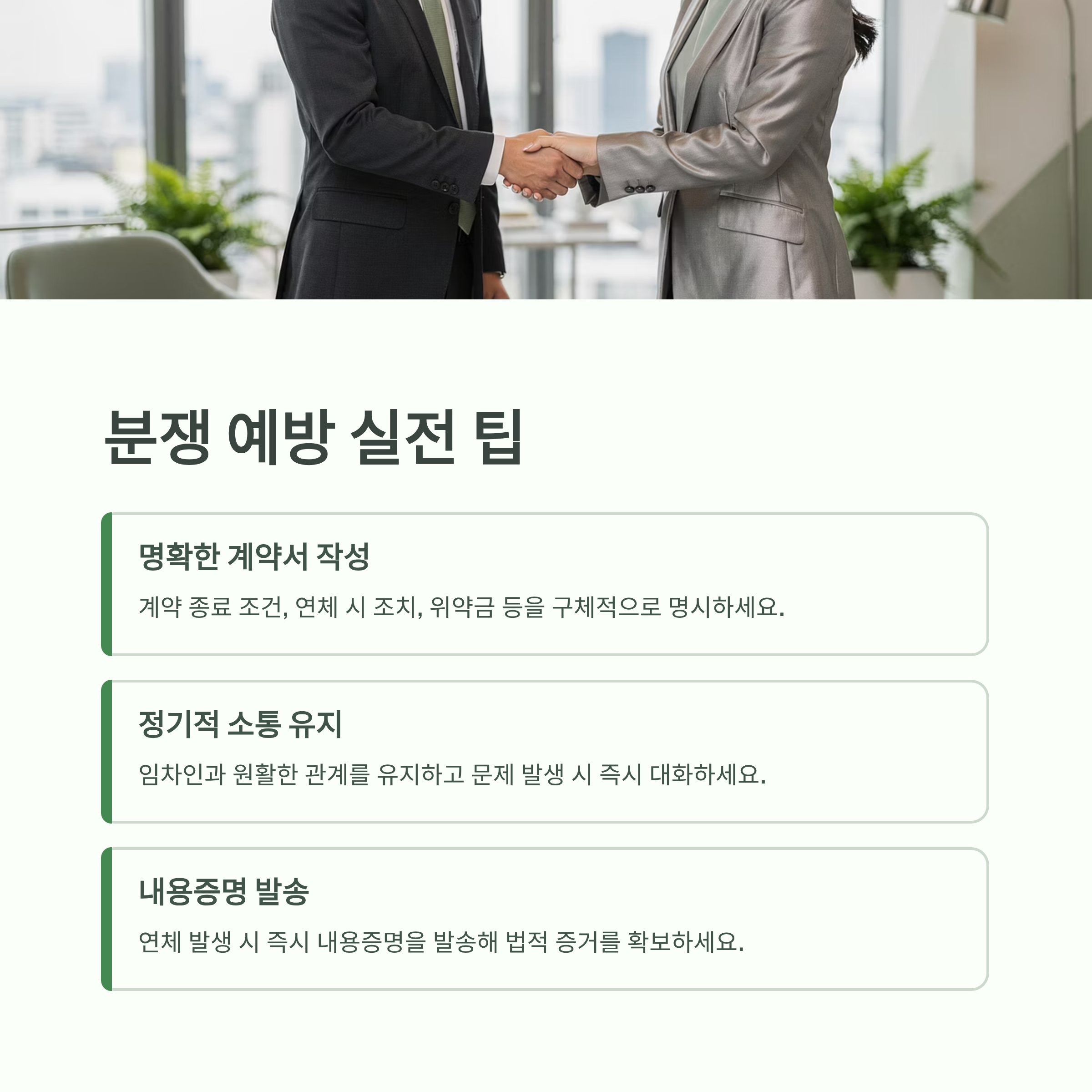 | 분쟁 예방 팁 | 계약서 명확화, 임차인 신뢰도 확인, 임대료 연체 관리, 해지 통보 증거 확보, 전문가 상담 | 소송 전 해결 노력, 불필요한 법적 분쟁 최소화 |