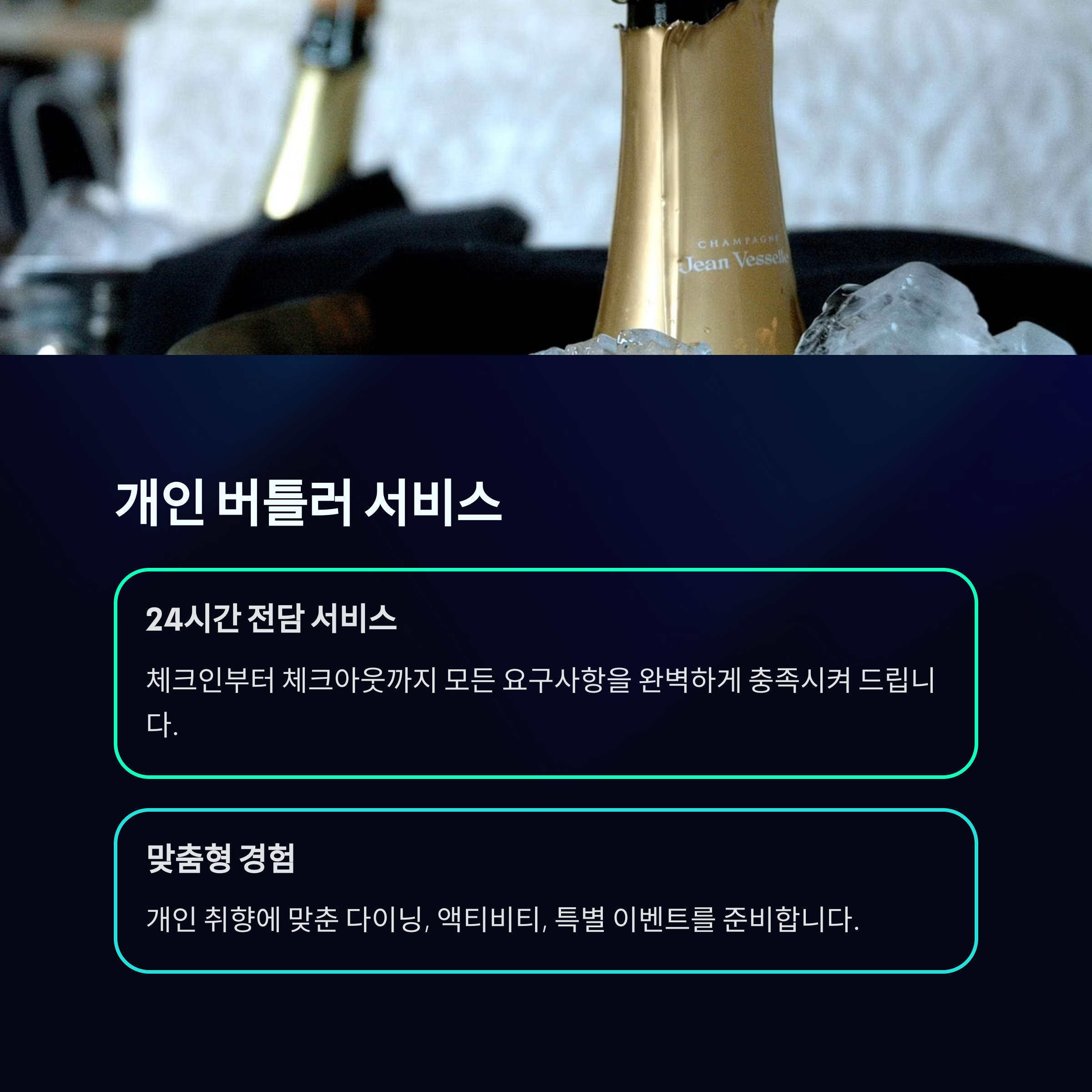 버틀러 서비스는 단순한 편의를 넘어 고객 한 명 한 명이 특별한 대우를 받고 있다는 느낌을 주며, 진정한 럭셔리를 경험하게 합니다.