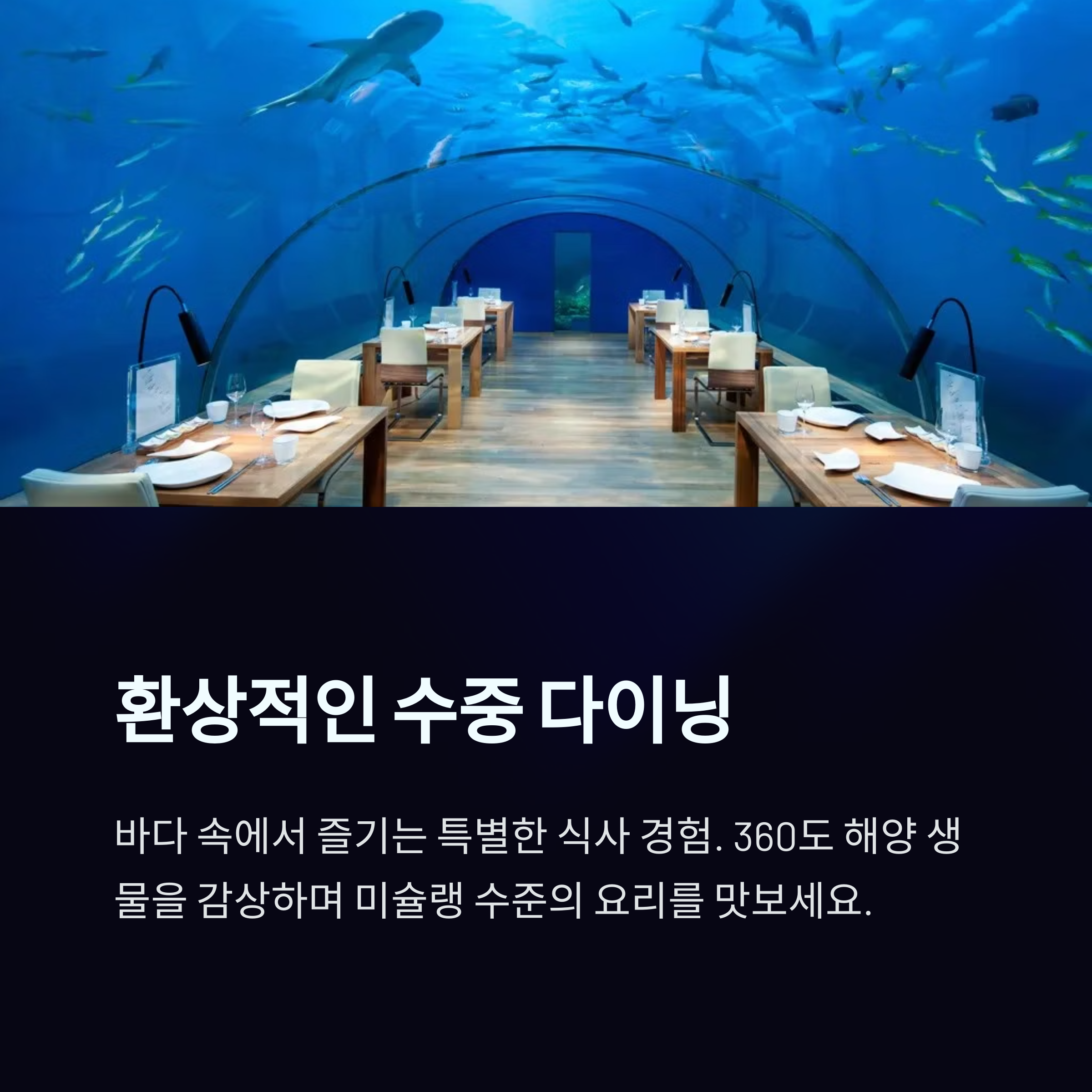 몰디브는 세계 최초의 수중 레스토랑과 빌라를 탄생시킨 곳으로, 바닷속 세상과 완벽하게 교감하는 특별한 경험을 제공합니다.