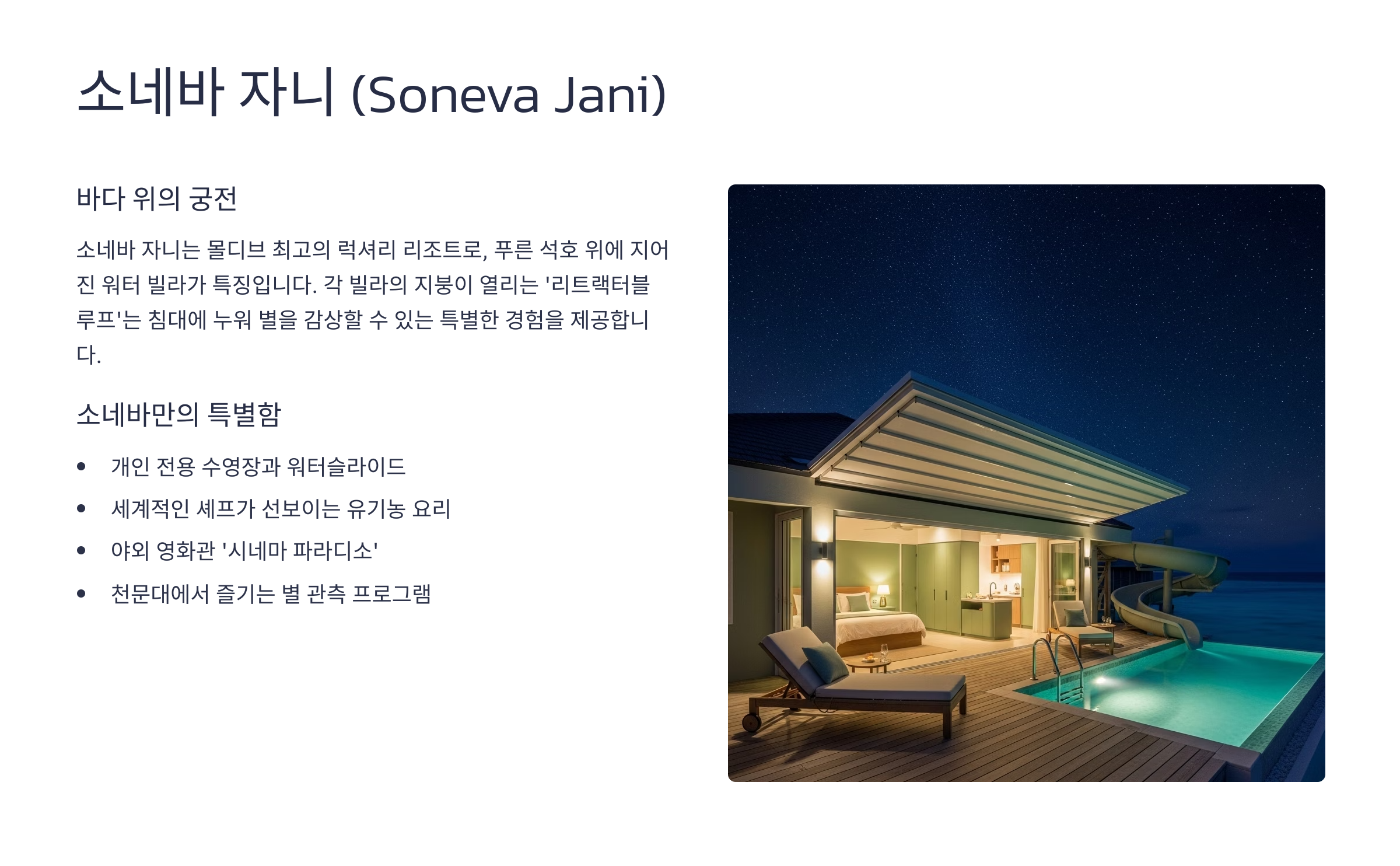소네바 자니는 '노 뉴스 노 슈즈(No News No Shoes)'라는 슬로건처럼 자연 친화적이고 편안하면서도 최고급 럭셔리를 지향하는 리조트입니다. 특히 워터 빌라의 슬라이드가 바다로 바로 연결되는 독특한 구조와 개폐식 지붕이 있는 침실로 유명해요. 밤하늘의 별을 보며 잠들 수 있는 특별한 경험을 제공합니다.
