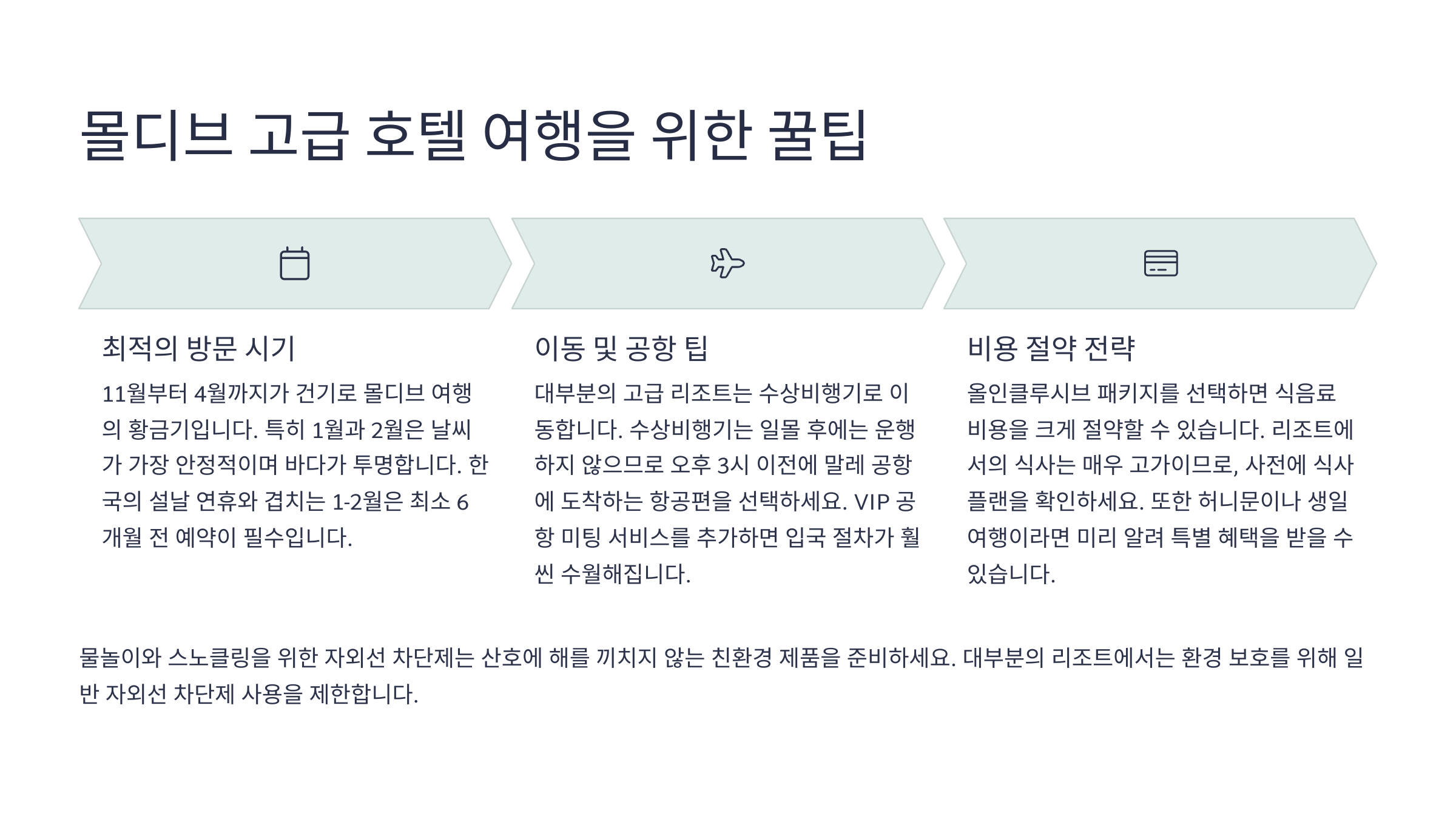 몰디브 여행은 큰 비용이 드는 만큼, 현명하게 준비하는 것이 중요합니다. 몇 가지 팁을 알려드릴게요.
