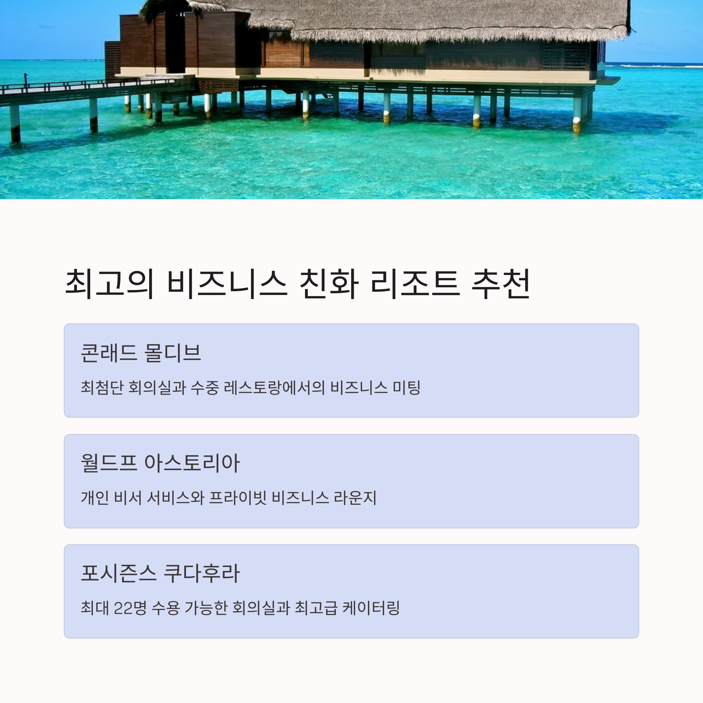 몰디브에는 비즈니스 여행객의 요구를 충족시키는 다양한 고급 리조트들이 있어요. 다음은 안정적인 업무 환경과 훌륭한 휴식 공간을 동시에 제공하는 추천 리조트들입니다.