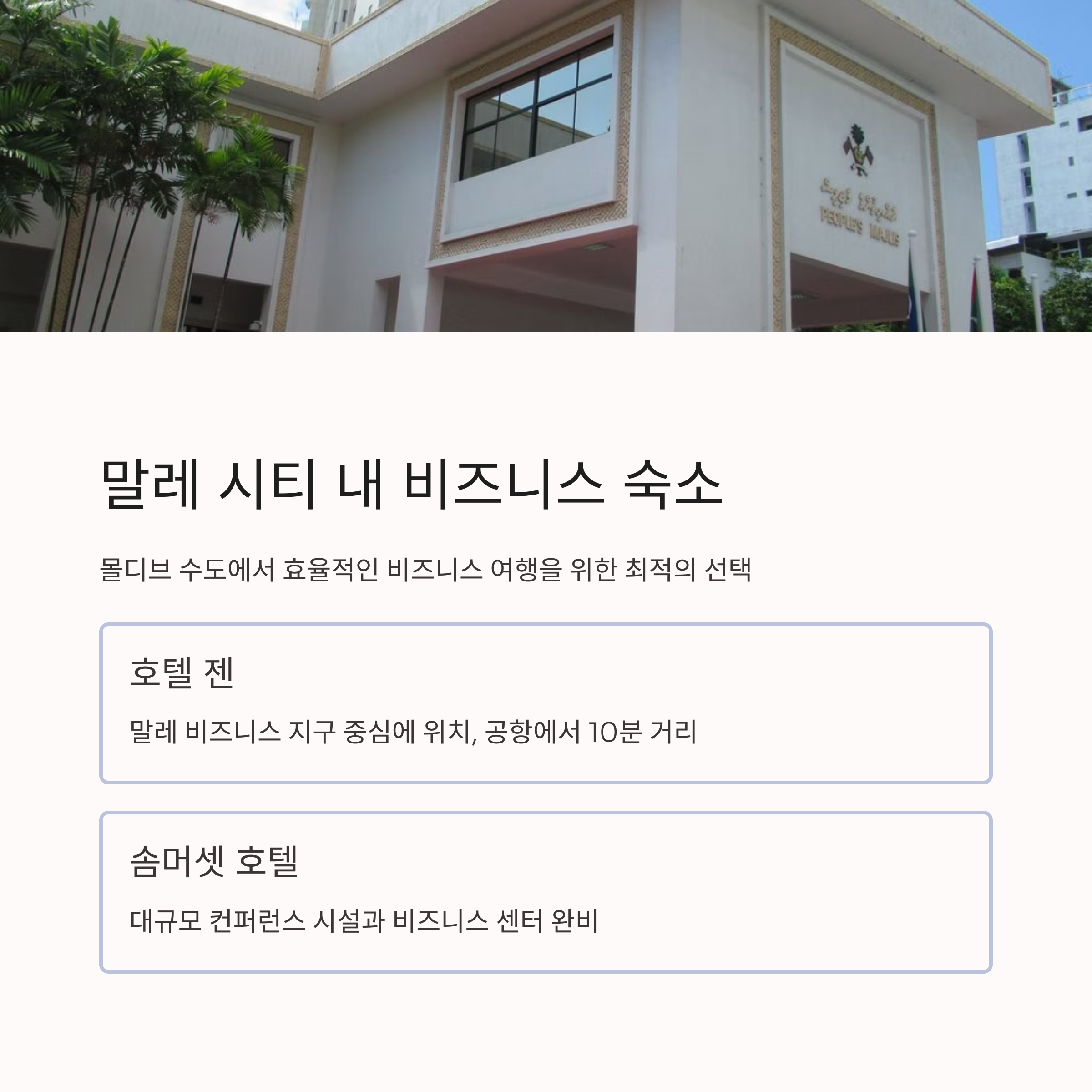 리조트섬이 아닌 몰디브의 수도 말레 시티에 머물러야 하는 비즈니스 여행객을 위한 팁도 알려드릴게요. 말레는 공항과 가깝고, 정부 기관 및 주요 기업들이 밀집해 있어 단기 출장에 적합합니다.