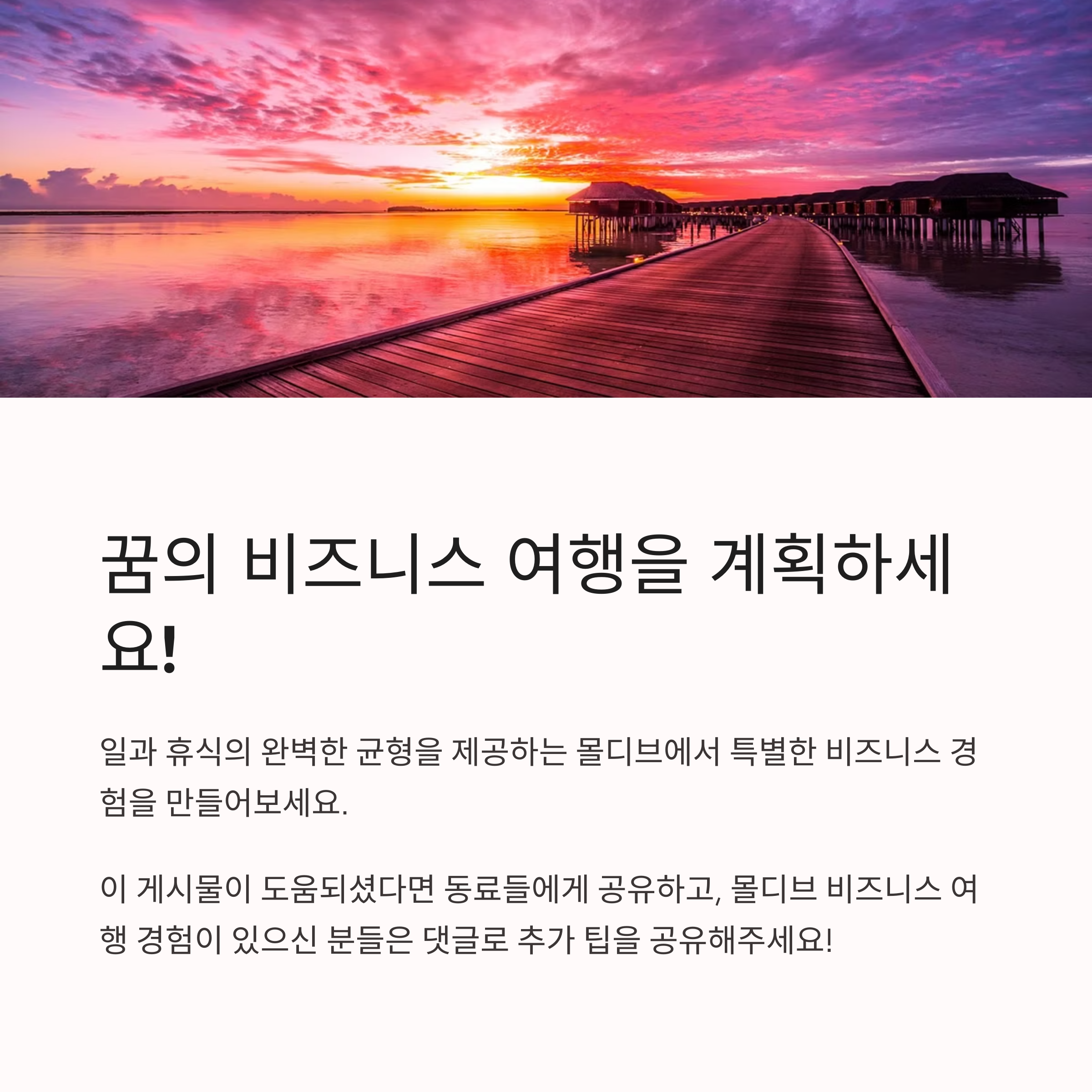 - 업무와 휴식의 균형: 아무리 비즈니스 여행이라도 몰디브의 아름다운 환경을 충분히 즐기세요. 잠깐의 휴식이나 액티비티가 오히려 업무 효율을 높일 수 있습니다.