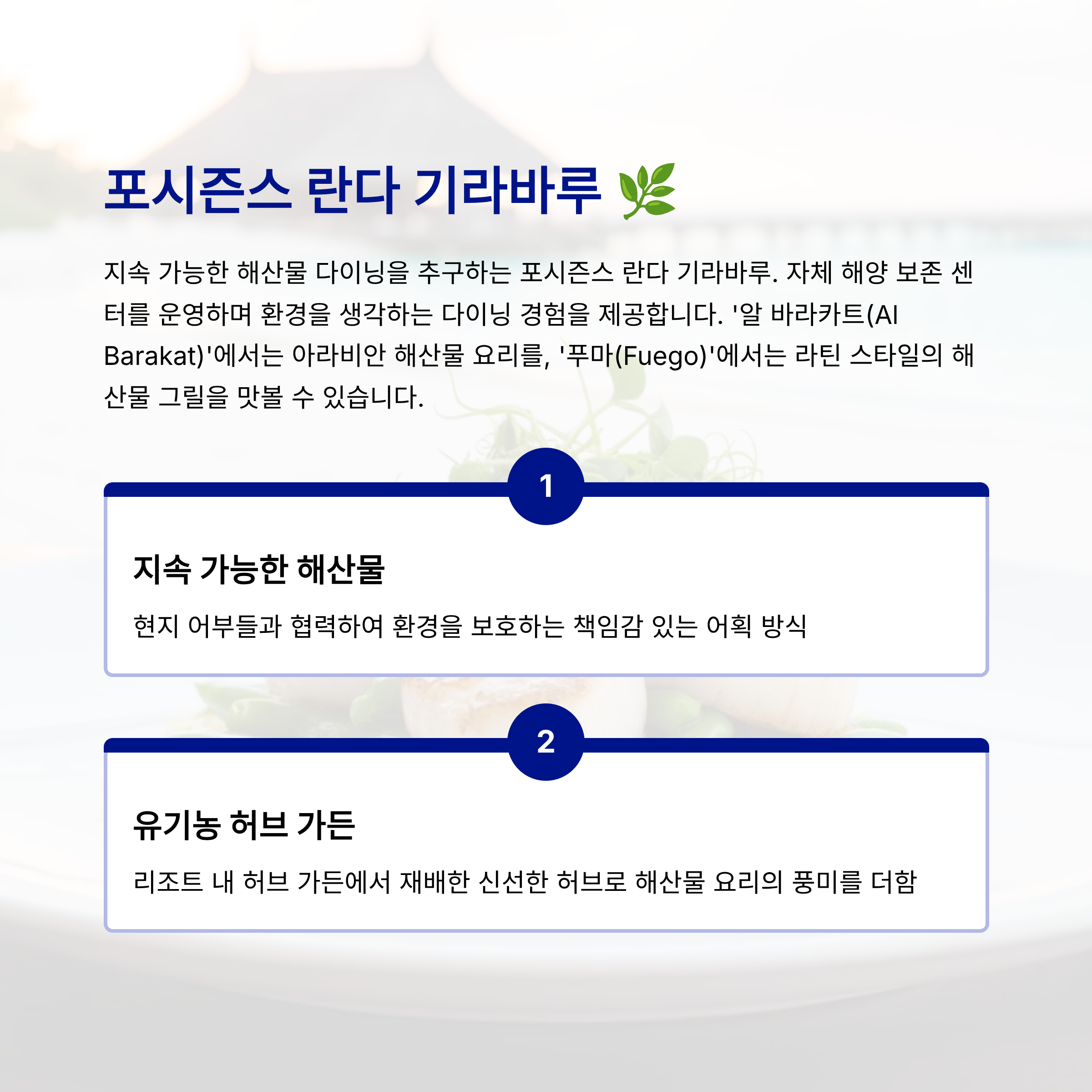 포시즌스 란다 기라바루는 유네스코 생물권 보전 지역인 바 아톨(Baa Atoll)에 위치하여, 청정한 자연 속에서 최고급 럭셔리를 경험할 수 있는 곳입니다. 이곳의 해산물 다이닝은 신선도뿐만 아니라 지속 가능성과 창의적인 조리법에 중점을 둡니다.