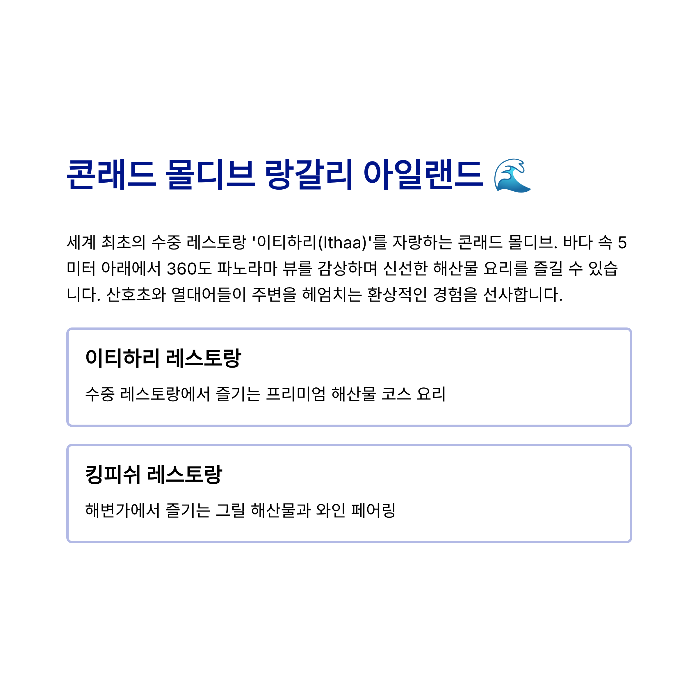 콘래드 랑갈리 아일랜드는 세계 최초의 수중 레스토랑 '이타(Ithaa)'로 명성이 자자합니다. 이 리조트는 혁신적인 다이닝 경험을 제공하는 선두 주자이며, 신선한 해산물 요리 또한 최고 수준을 자랑합니다.