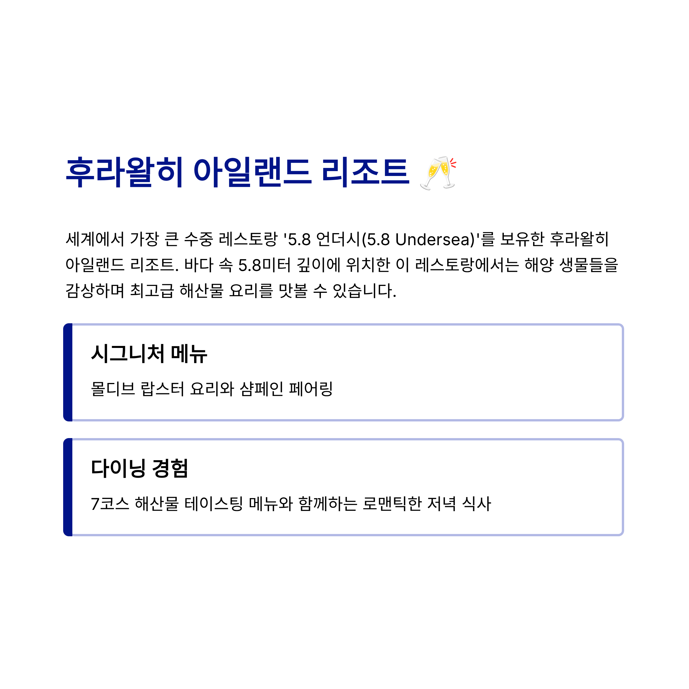 후라왈히 아일랜드 리조트는 세계에서 가장 큰 올 글래스(All-Glass) 수중 레스토랑인 '5.8 언더씨 레스토랑'으로 유명합니다. 성인 전용 리조트로, 로맨틱하고 고급스러운 분위기 속에서 최고의 해산물 요리를 즐길 수 있습니다.