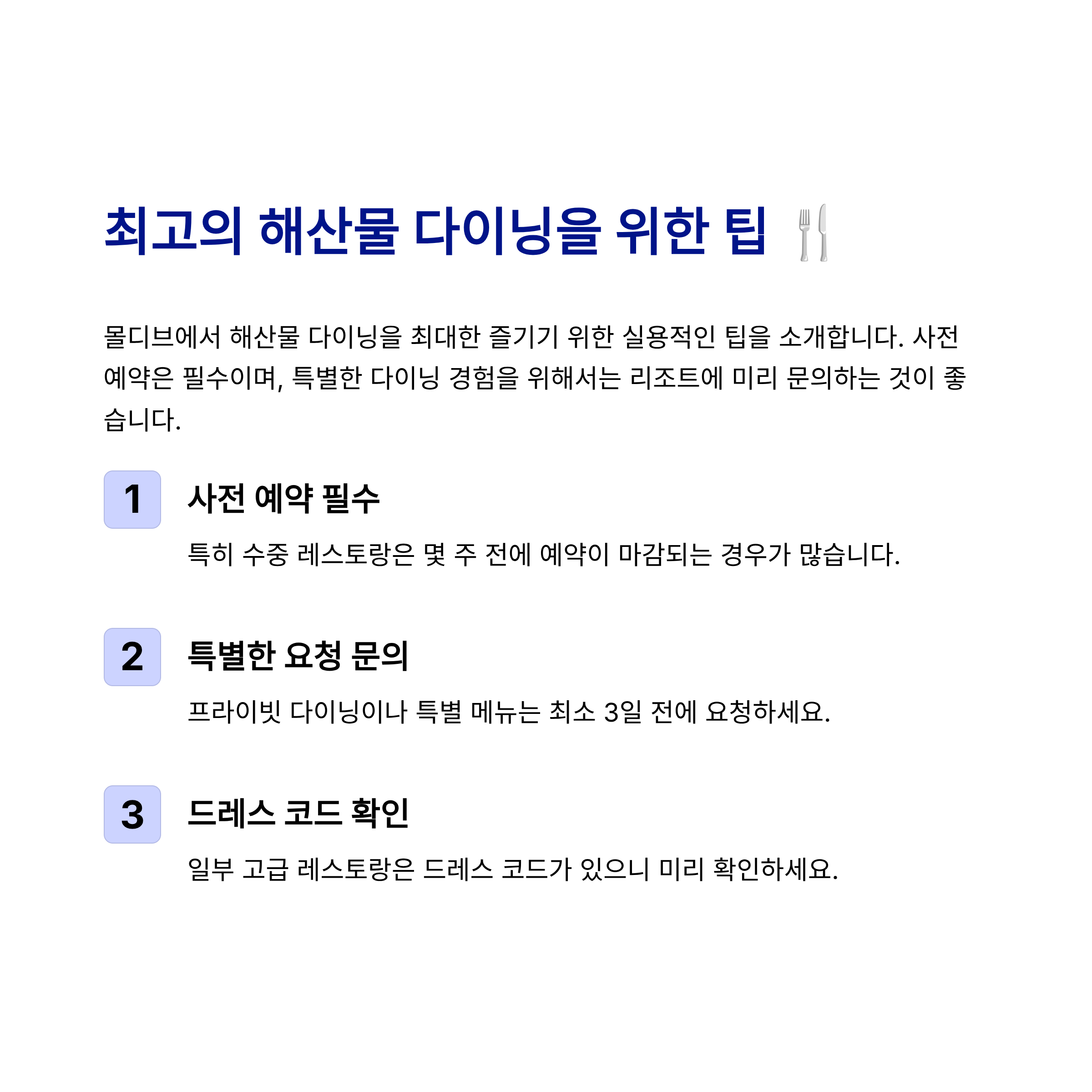 이 팁들을 잘 활용하여 몰디브에서의 해산물 다이닝을 최고의 추억으로 만드세요!