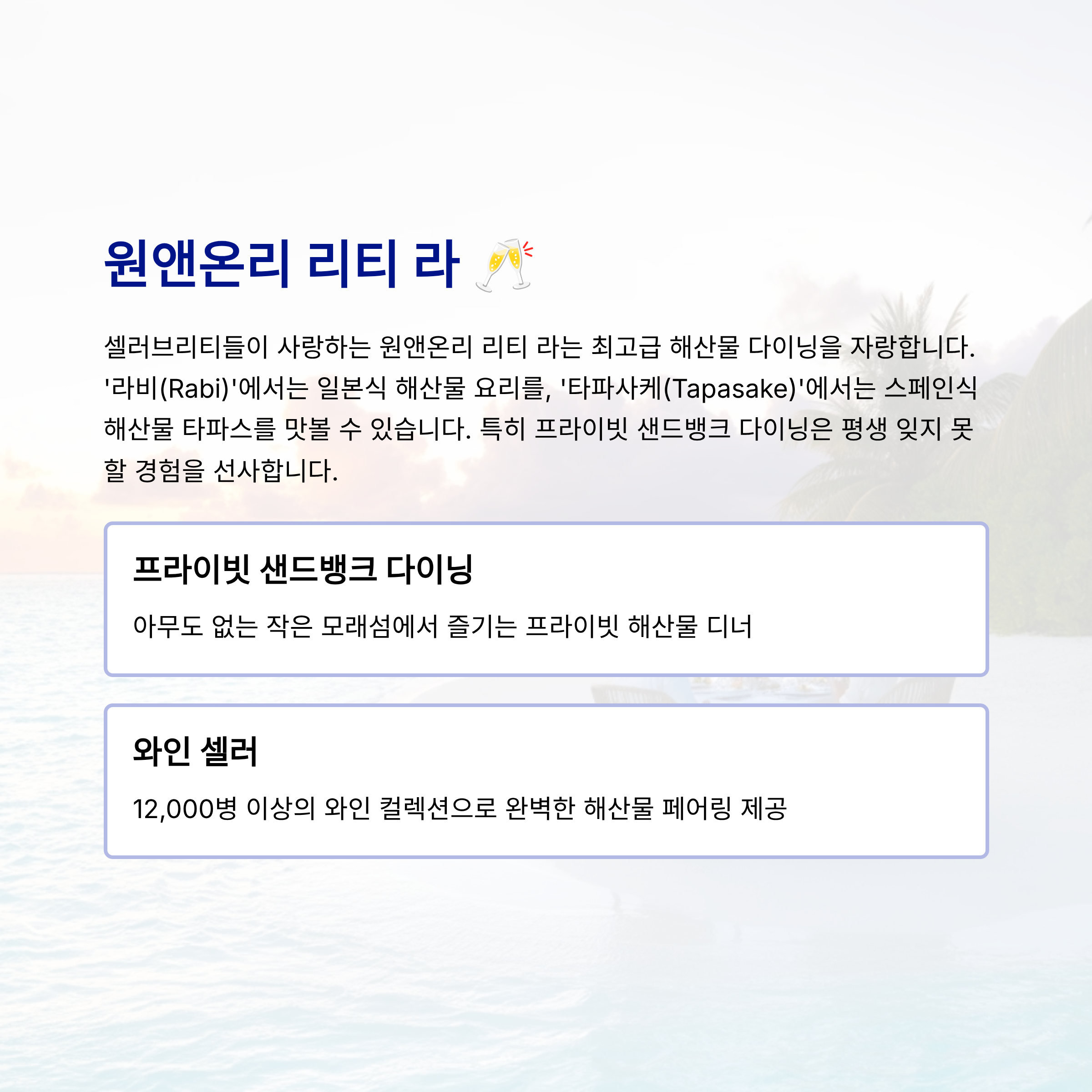 - 독창적인 다이닝 공간: 수중 레스토랑, 해변 프라이빗 디너, 트리탑 레스토랑 등 독특한 분위기 속에서 식사를 즐길 수 있습니다.