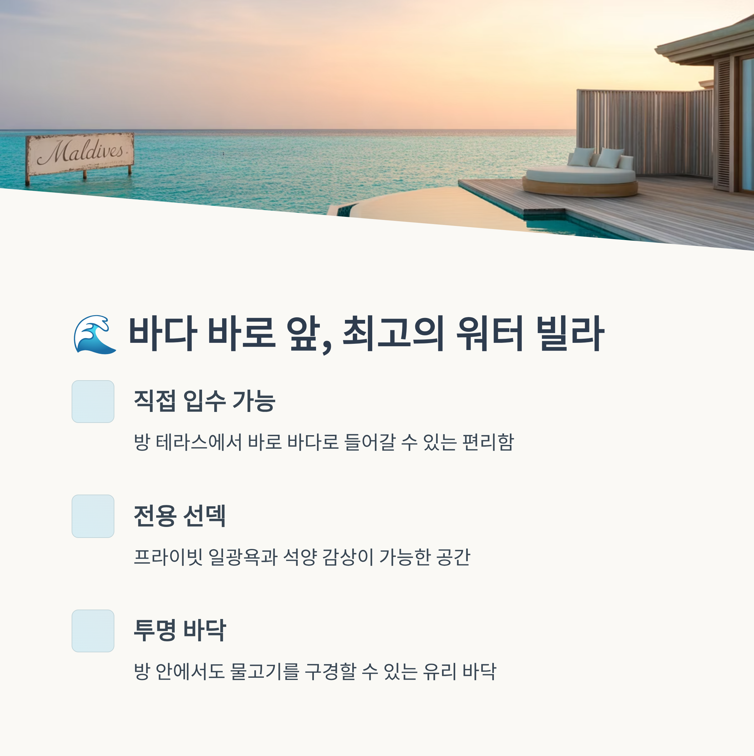 | 수상 빌라 | 바다 위에 지어진 독립형 숙소 | 프라이버시와 경관 모두 만족 |