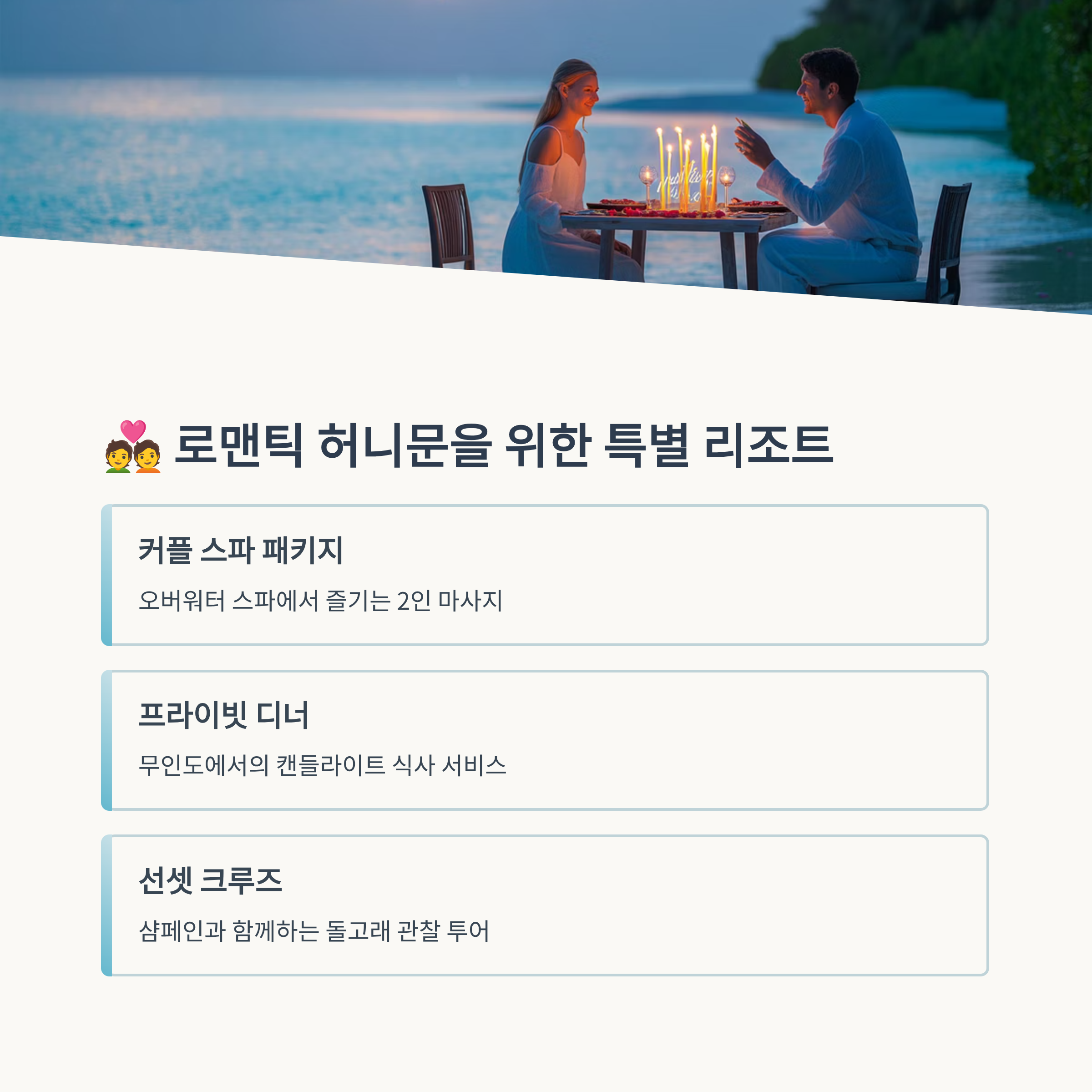 또한 허니문이라면 해양 액티비티보다는 여유 있는 휴식과 감성적인 분위기를 중심으로 일정 구성하는 걸 추천해요. 둘만의 전용 공간에서 서로에게 집중하는 시간을 보내는 것, 그게 가장 큰 여행의 선물이죠.