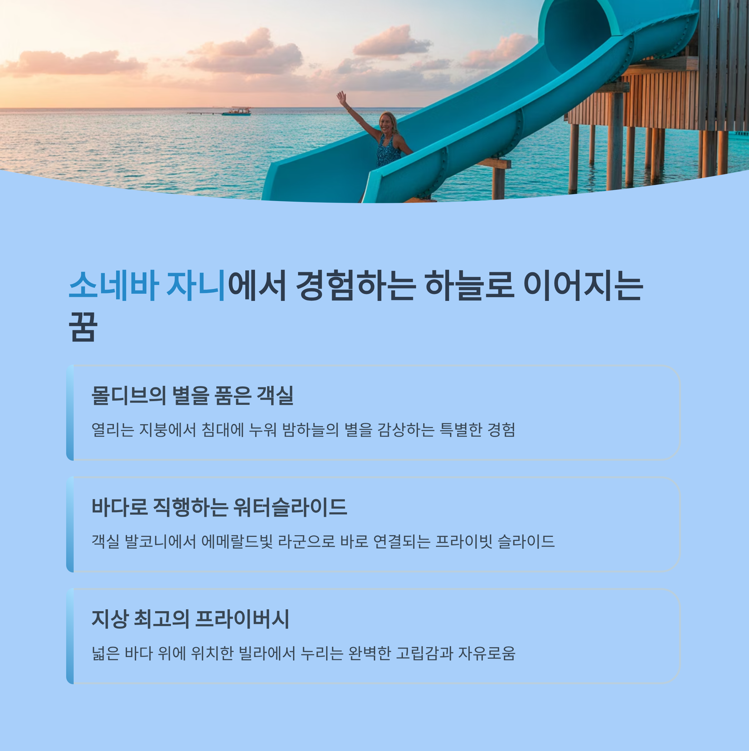 - 개인 워터 슬라이드: 모든 워터 빌라에는 2층에서 바다로 바로 연결되는 워터 슬라이드가 있어 짜릿한 즐거움을 선사합니다.