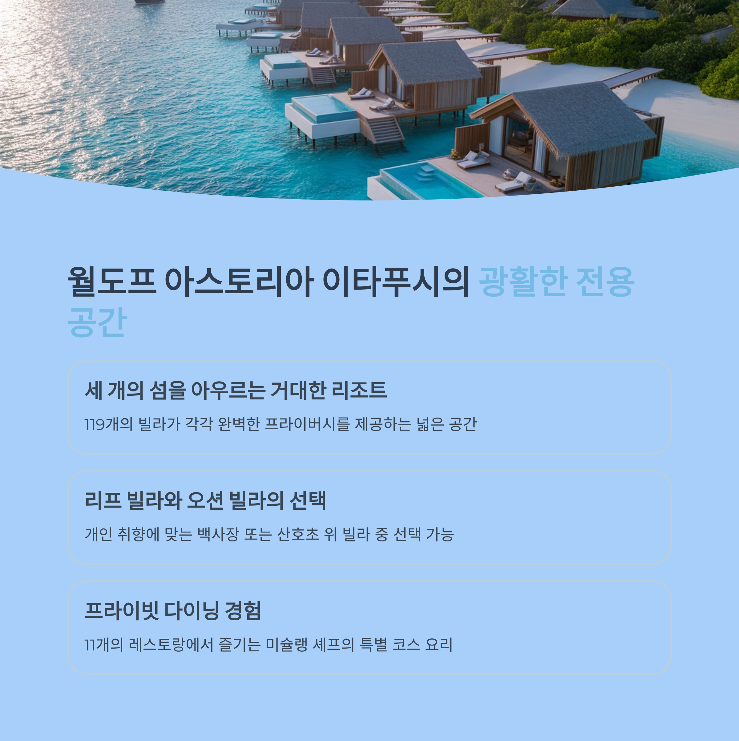 3. 월도프 아스토리아 몰디브 이타푸시 (Waldorf Astoria Maldives Ithaafushi): 광활한 전용 공간 🌴