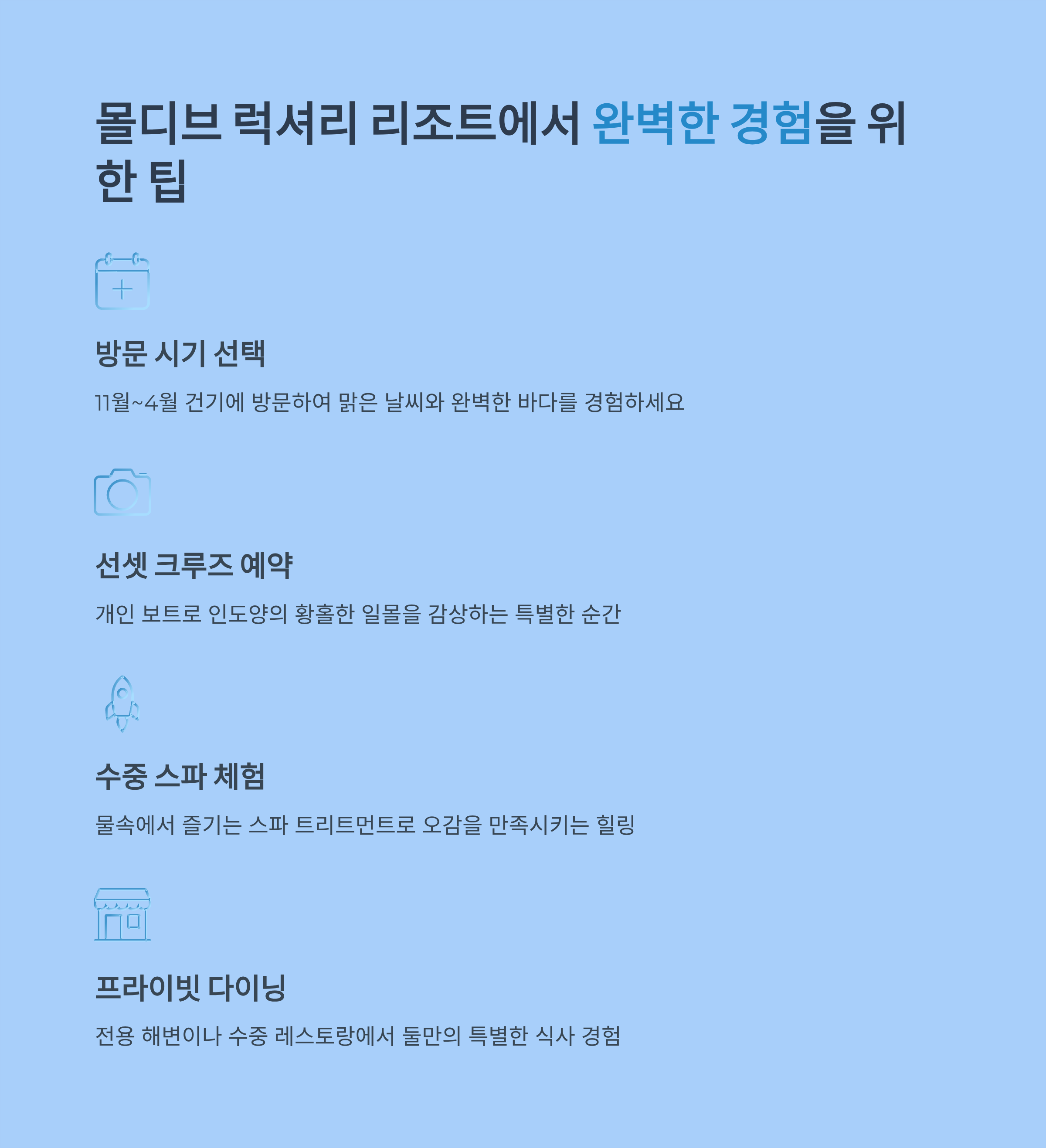 이 팁들을 잘 활용하여 몰디브에서의 전용 해변과 수영장 경험을 최고의 추억으로 만드세요!