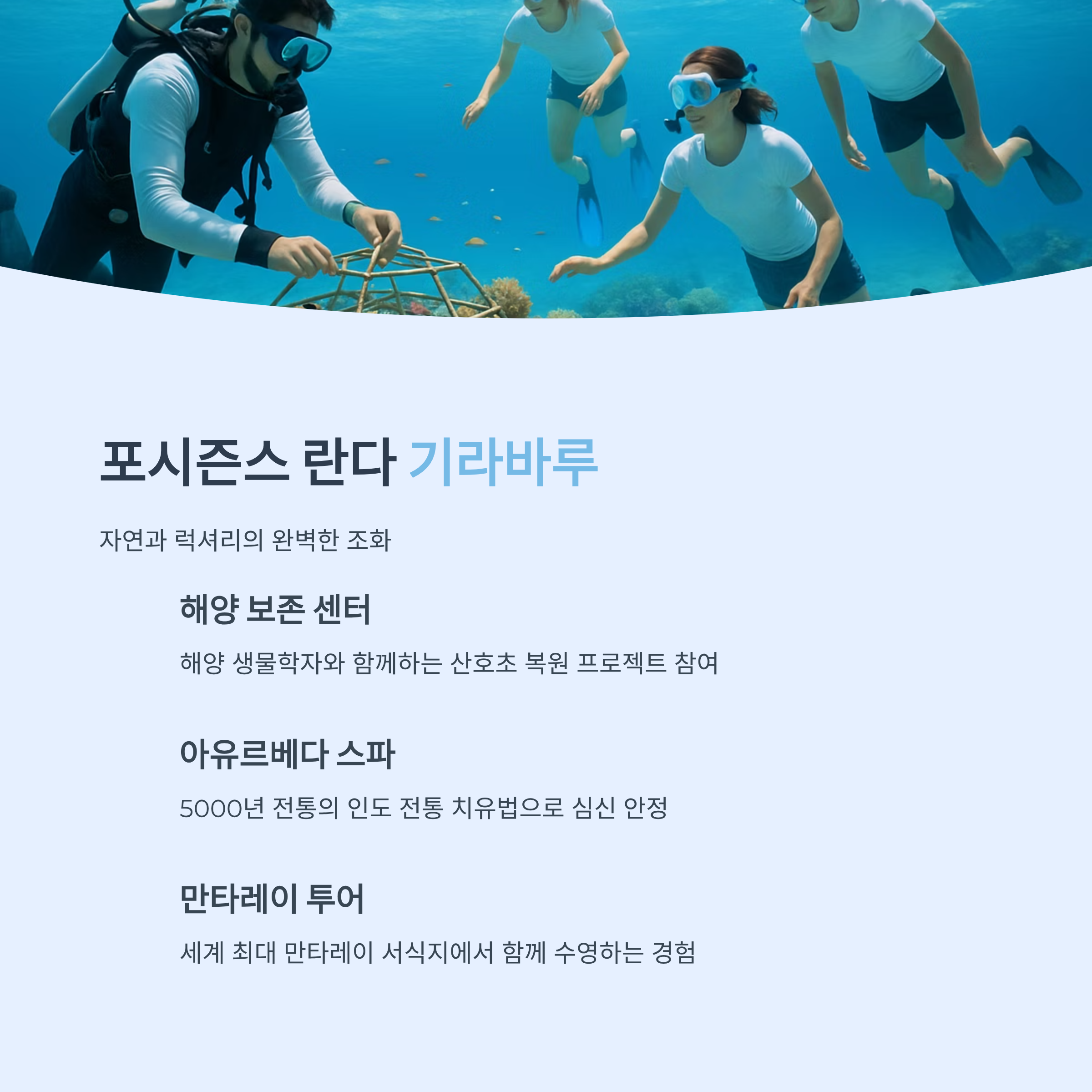 • 해양 생물 보호 프로그램: 거북이 보호, 산호 복원 등 친환경적인 액티비티.