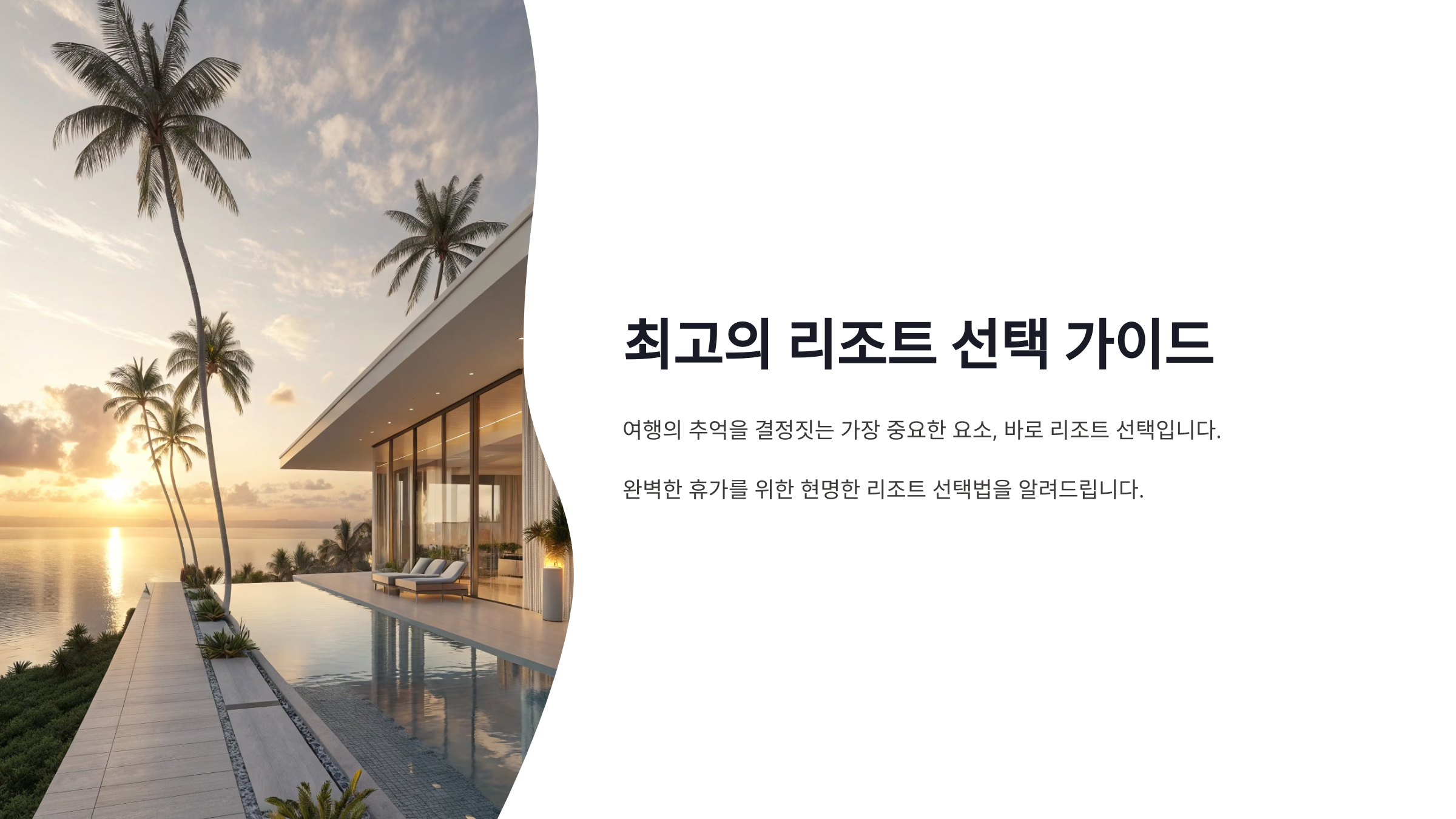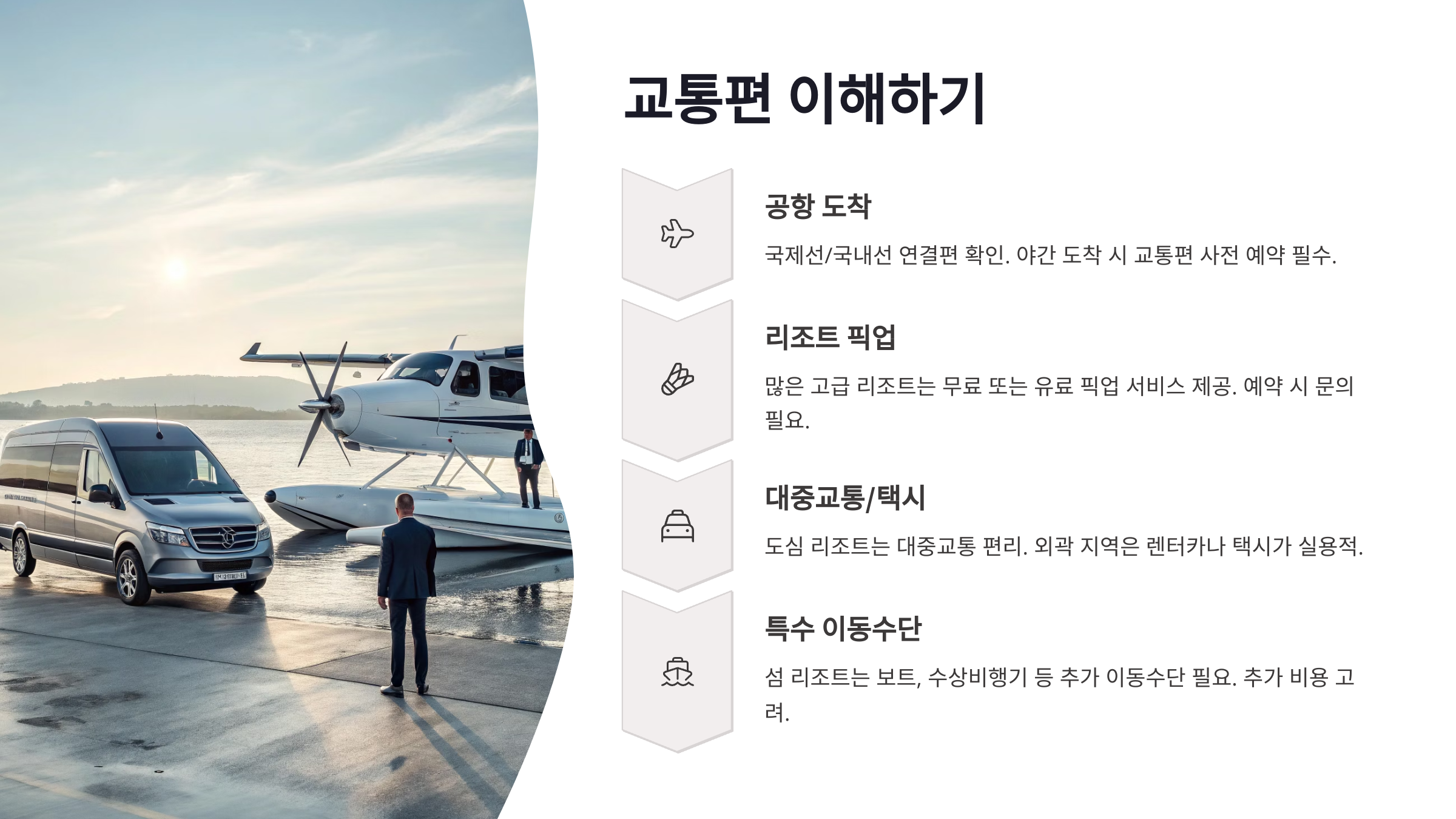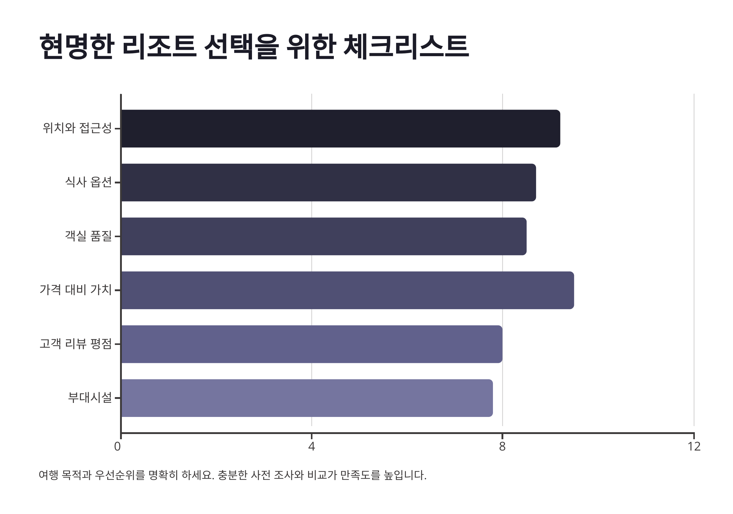 동행자가 커플인지 가족인지에 따라 리조트의 분위기와 서비스 수준이 다릅니다. 본인의 여행 목적을 명확히 파악하는 것이 우선입니다.
