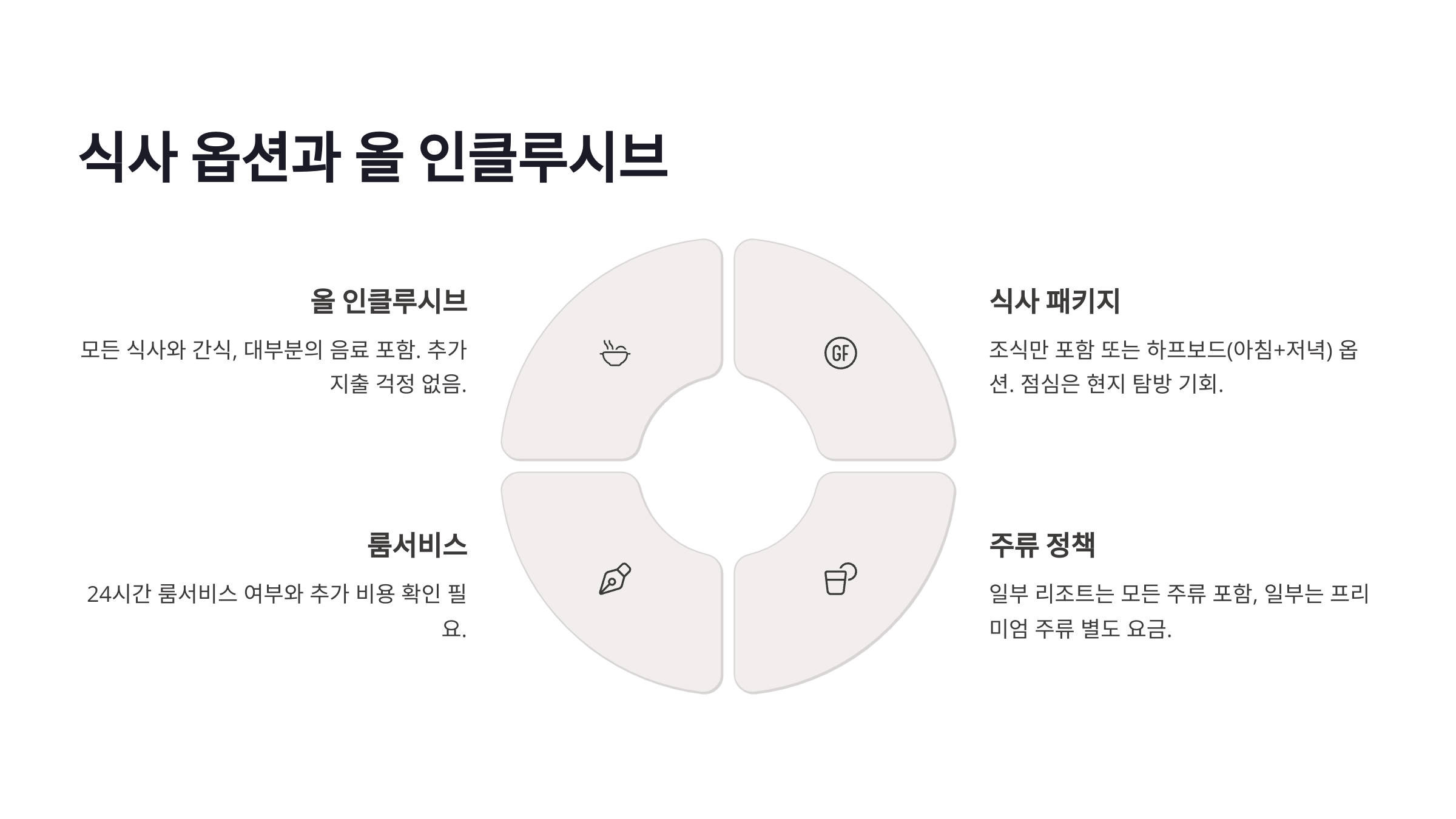 | 럭셔리형 | 프라이빗 풀, 고급 다이닝 | 허니문, 특별한 기념일 |