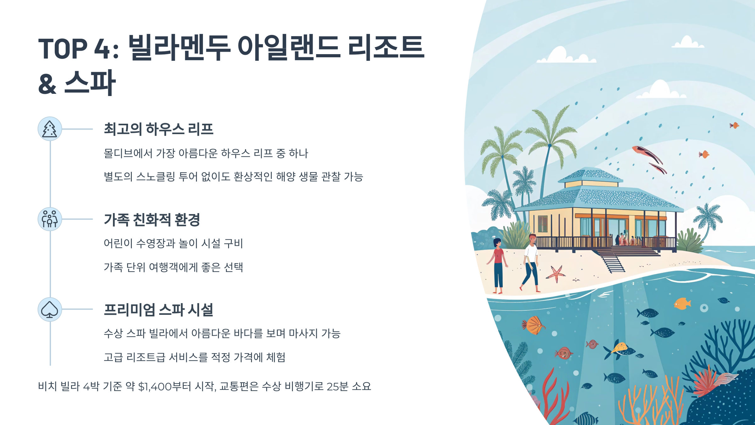 - 추천 대상: 스노클링을 중요하게 생각하는 여행객, 아이 동반 가족, 합리적인 가격에 몰디브를 경험하고 싶은 여행객