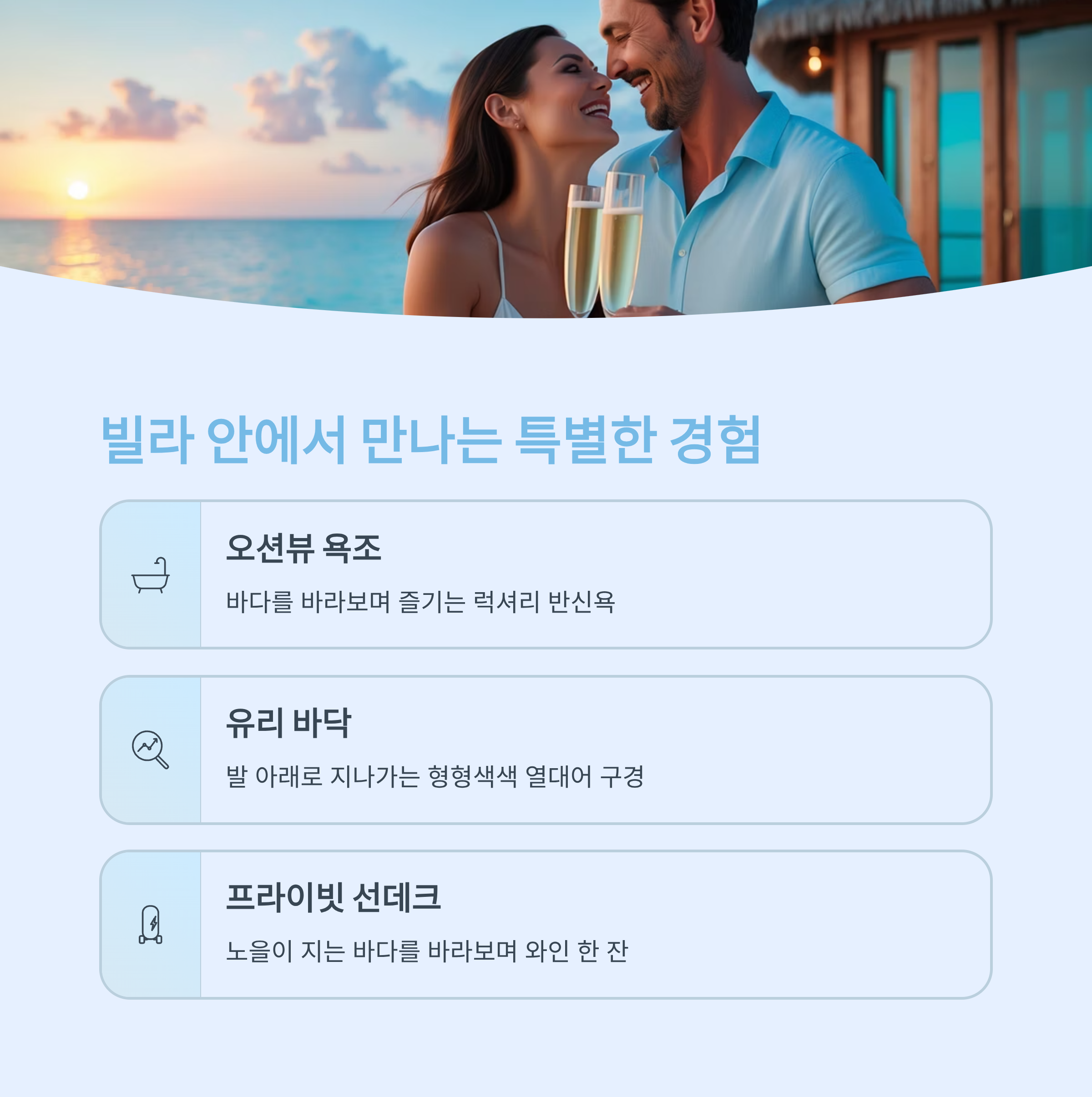 수상 빌라는 객실 자체가 하나의 완벽한 휴식처이자 놀이 공간입니다. 빌라 안에서만 누릴 수 있는 특별한 경험들이 몰디브 여행의 만족도를 극대화합니다.
