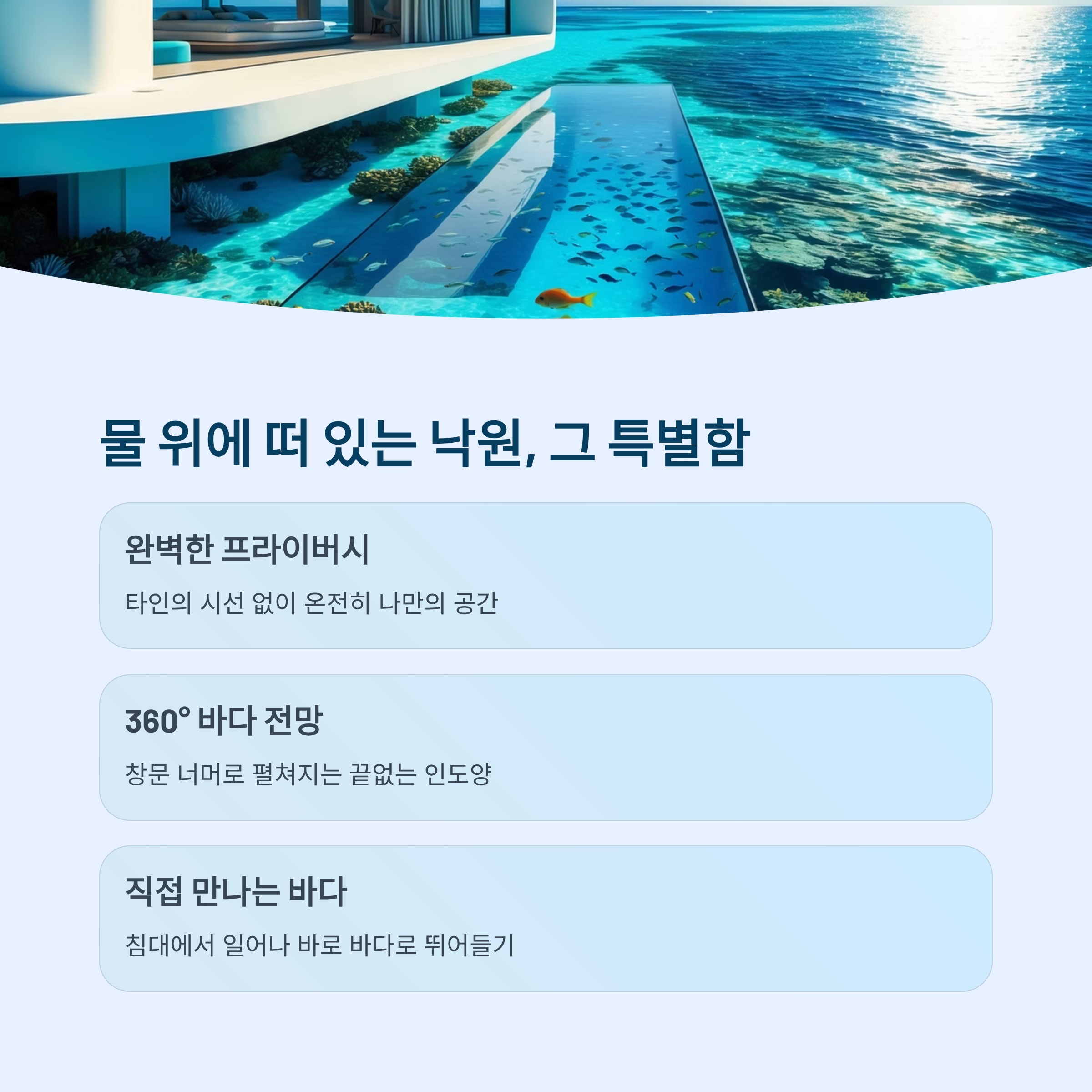 수상 빌라의 독특함은 단순히 바다 위에 지어졌다는 물리적 사실을 넘어, 투숙객에게 '완벽한 고립감 속에서의 자유'와 '자연과의 완벽한 조화'를 선사하는 데 있습니다.