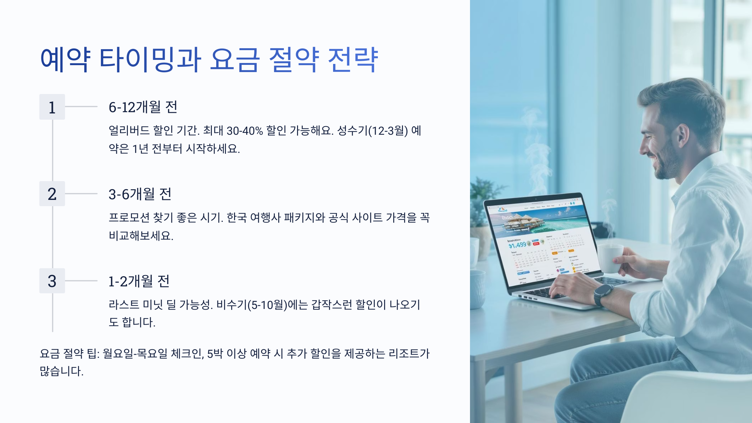 이제 다음으로, 언제 어떻게 예약하면 가장 저렴하게 몰디브 워터빌라를 이용할 수 있을지, 예약 타이밍과 요금 전략을 알려드릴게요! 📅