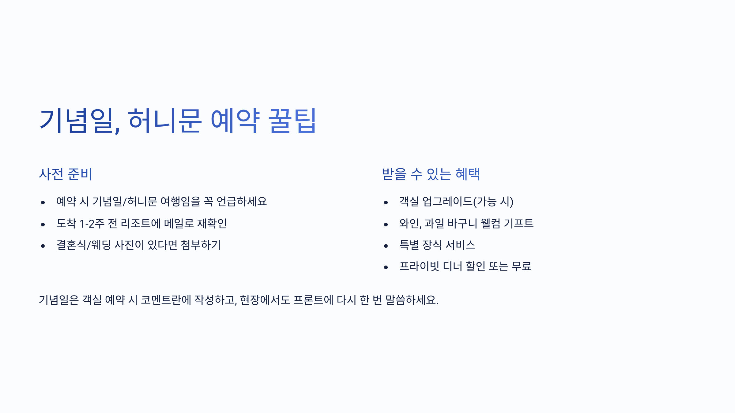 이제 마지막 실전 팁으로 넘어가요! 기념일, 허니문, 생일 등 특별한 날에 예약하면 무료 혜택이 쏟아진다는 거 알고 계셨나요? 다음 섹션에서 꼭 챙겨야 할 꿀팁 알려드릴게요! 🎉