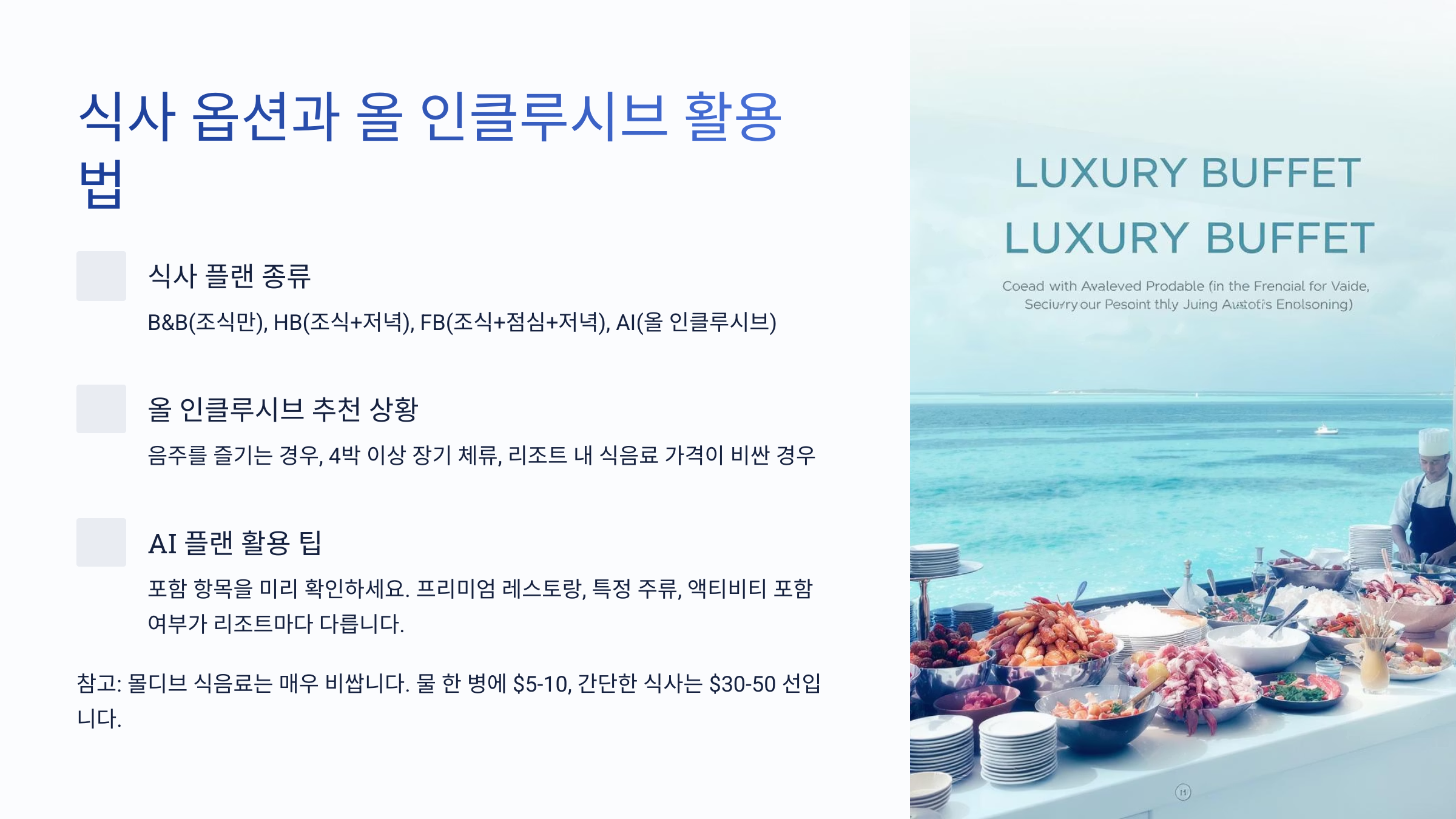 그럼 다음은 몰디브 숙소의 또 하나 중요한 요소! 식사 옵션과 올 인클루시브에 대해 알려드릴게요. 배고픈 여행은 절대 안 돼요! 🍽️