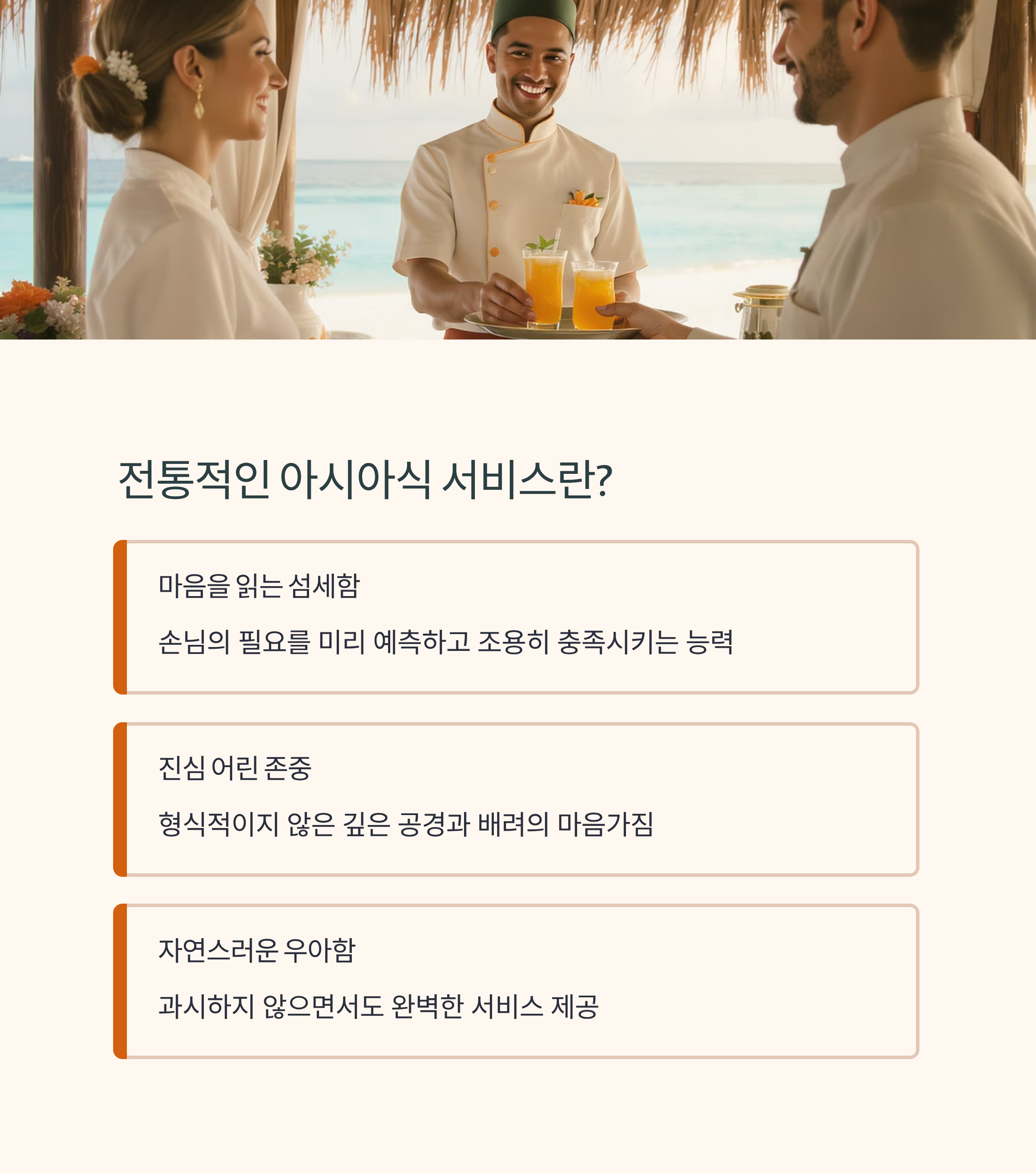 자, 그럼 다음은 ‘전통적인 아시아식 서비스의 본질’이 무엇인지 더 자세히 알아볼 차례예요. 📝