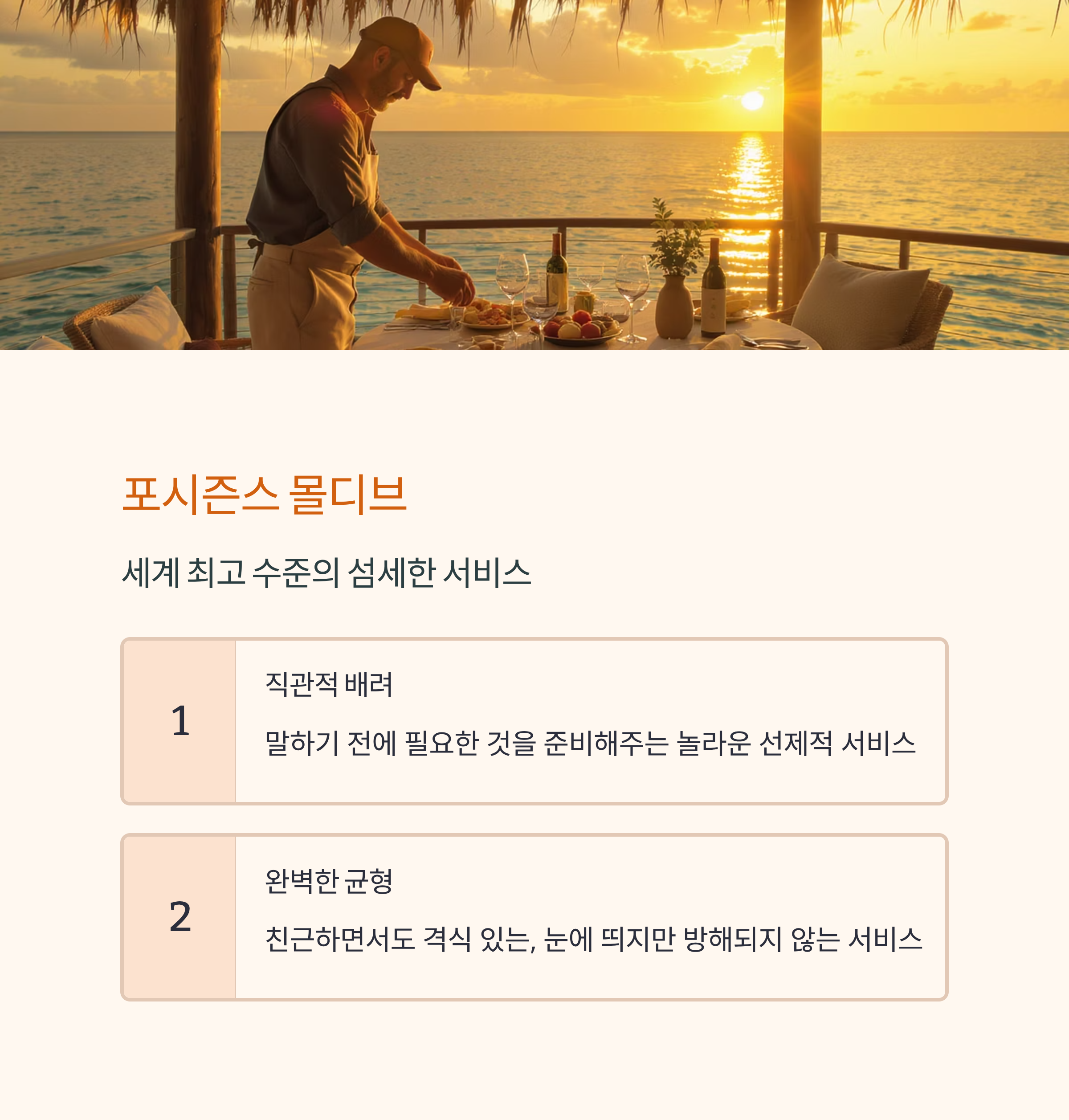 아시아식 서비스는 몰디브 여행에 깊이와 따뜻함을 더합니다. 📋