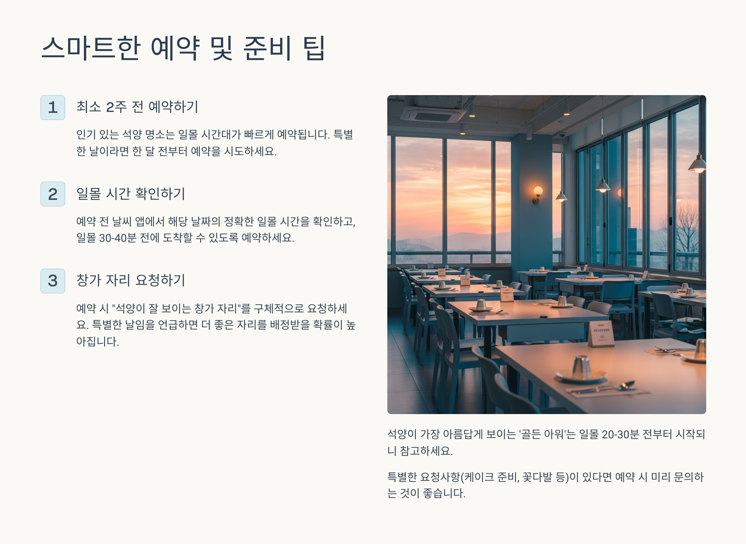 | 시간 엄수 | 예약 시간 준수, 석양 시간 놓치지 않기 | 최고의 순간 만끽, 타인에게 피해 방지 |