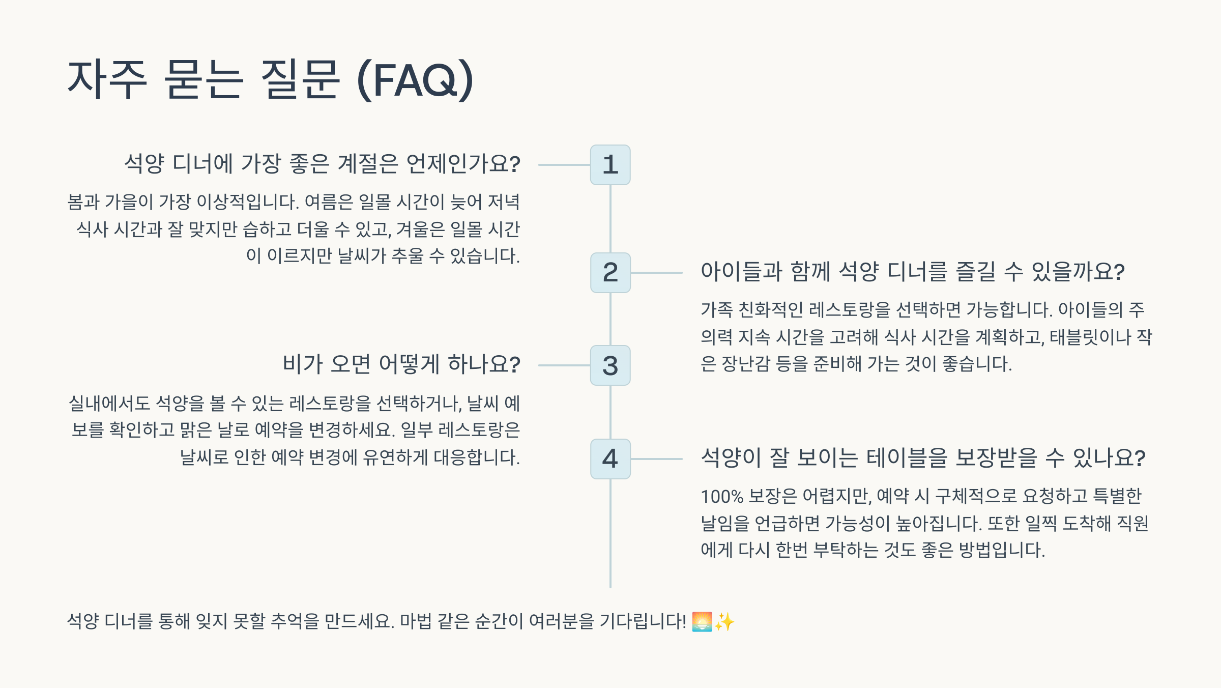 | 시간 엄수 | 예약 시간 준수, 석양 시간 놓치지 않기 | 최고의 순간 만끽, 타인에게 피해 방지 |
