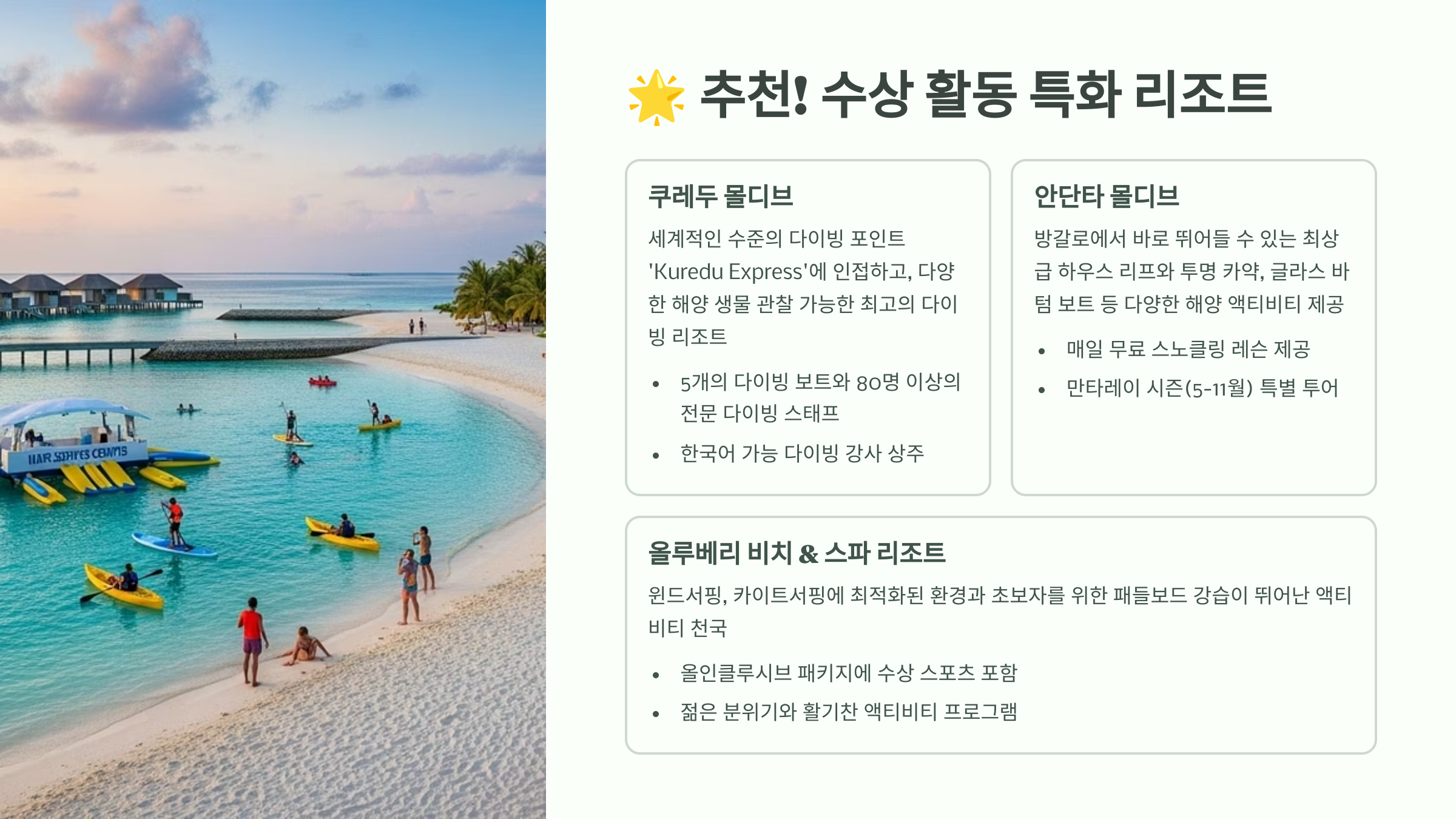 수상 활동은 몰디브 여행의 꽃이에요. 현명한 리조트 선택으로 최고의 바다 경험을 만끽하세요! ✨