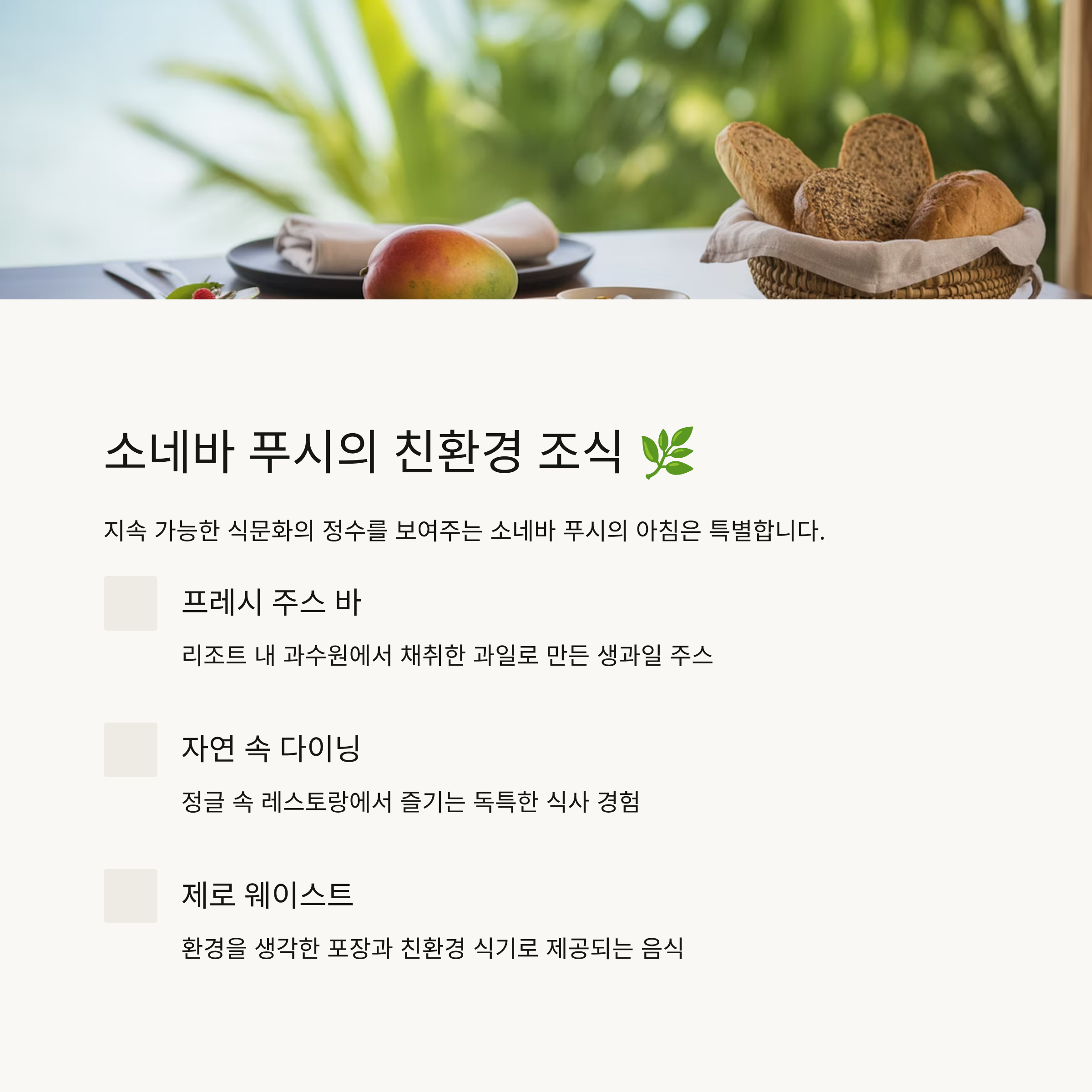 소네바 푸시는 몰디브의 지속 가능한 고급 리조트로 유명한데요, 조식 또한 철저하게 환경과 웰빙을 고려해 구성되어 있어요.