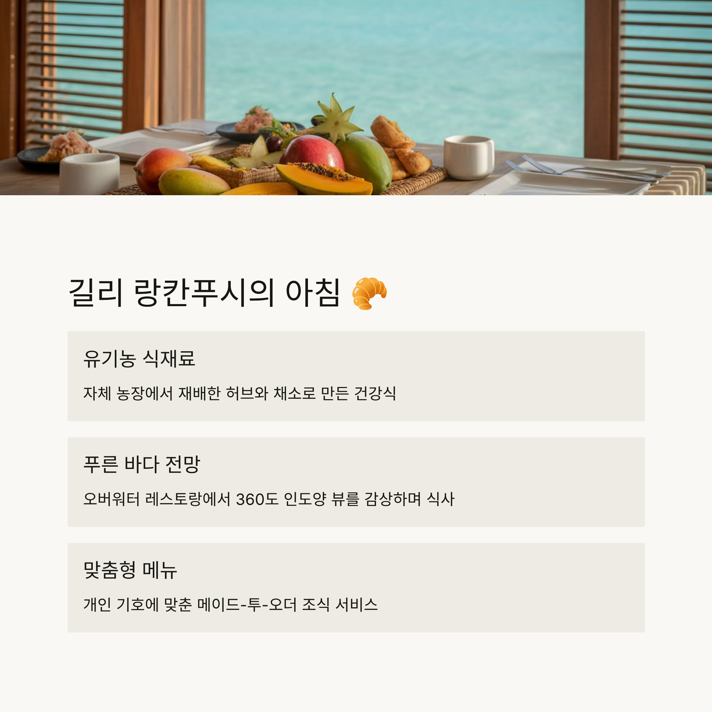길리 랑칸푸시는 몰디브에서도 가장 친환경적인 리조트 중 하나로, 조식도 이 철학을 그대로 담고 있어요. 유기농 재료를 기반으로 한 메뉴 구성은 건강과 맛을 모두 잡았답니다.
