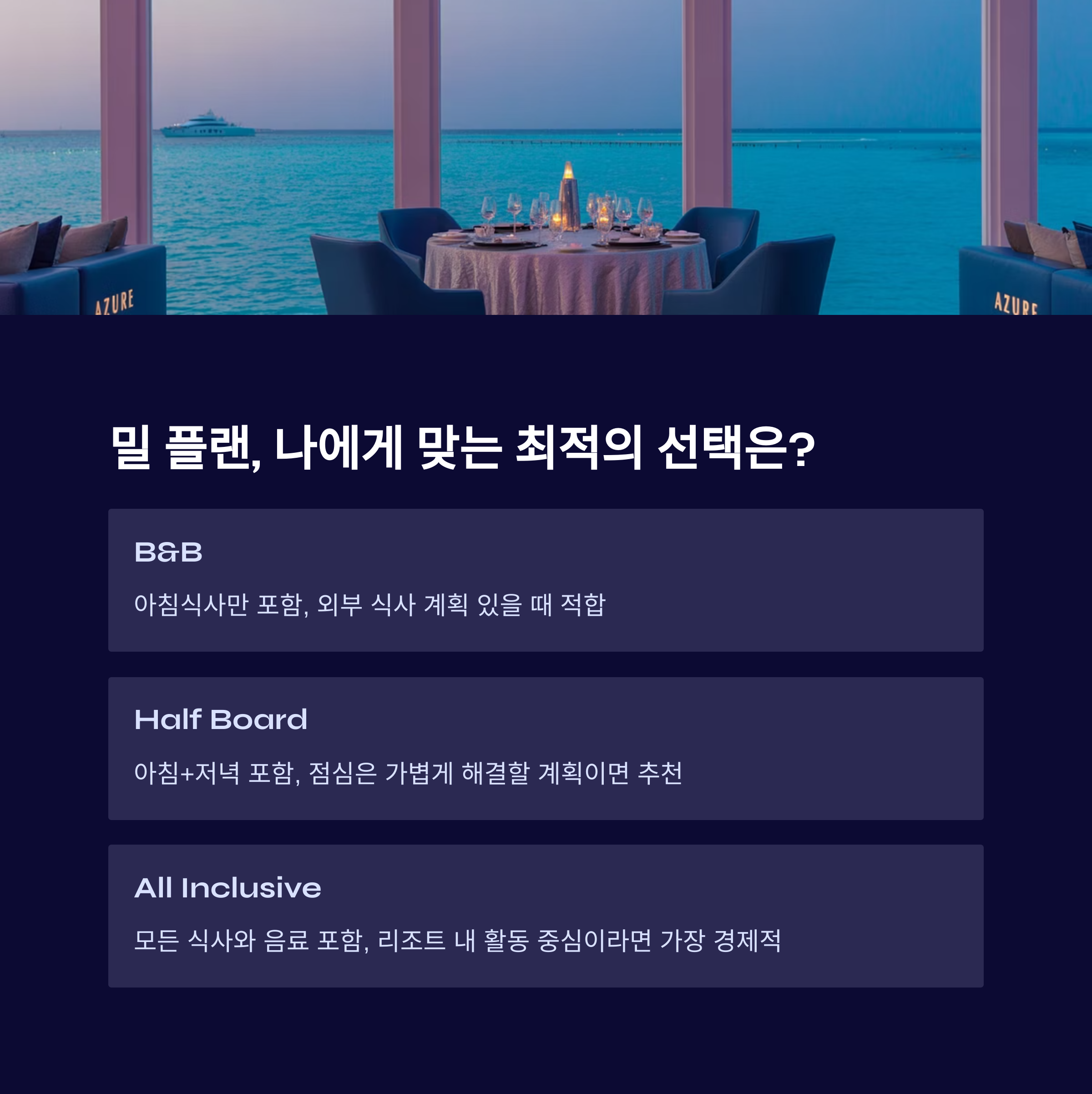 몰디브 리조트의 '밀 플랜(Meal Plan)' 선택은 총 경비에 큰 영향을 미쳐요. 무조건 올인클루시브(All-Inclusive)가 정답은 아니에요. 나의 식사 습관과 여행 스타일에 맞춰 최적의 플랜을 선택하는 것이 중요합니다.
