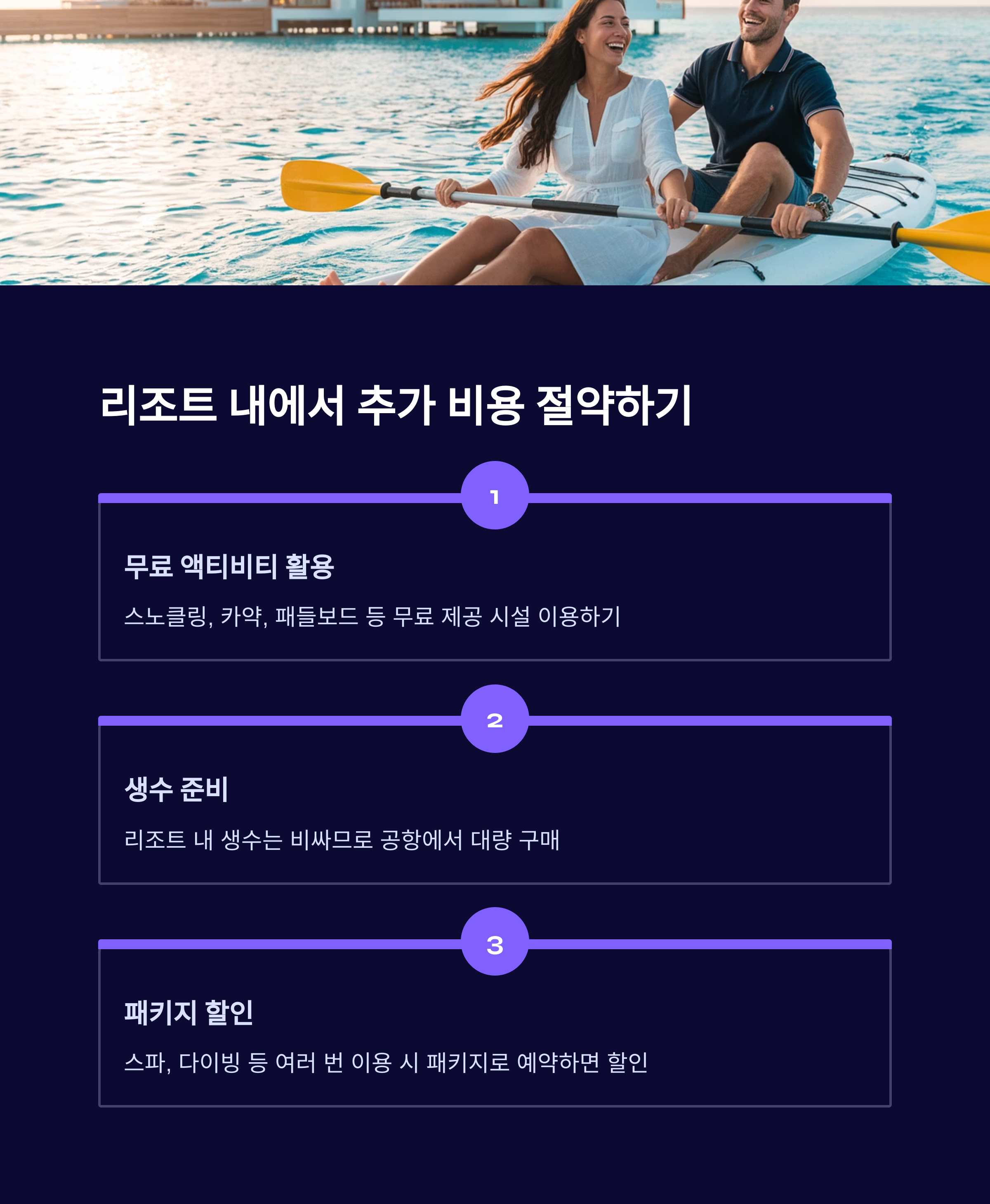 대부분의 리조트에서 스노클링 장비 대여, 카약, 패들보드 등 비동력 해양 스포츠는 무료로 제공돼요. 유료 액티비티에만 집중하기보다는 무료로 즐길 수 있는 것들을 적극적으로 활용하면 비용을 절감할 수 있습니다.