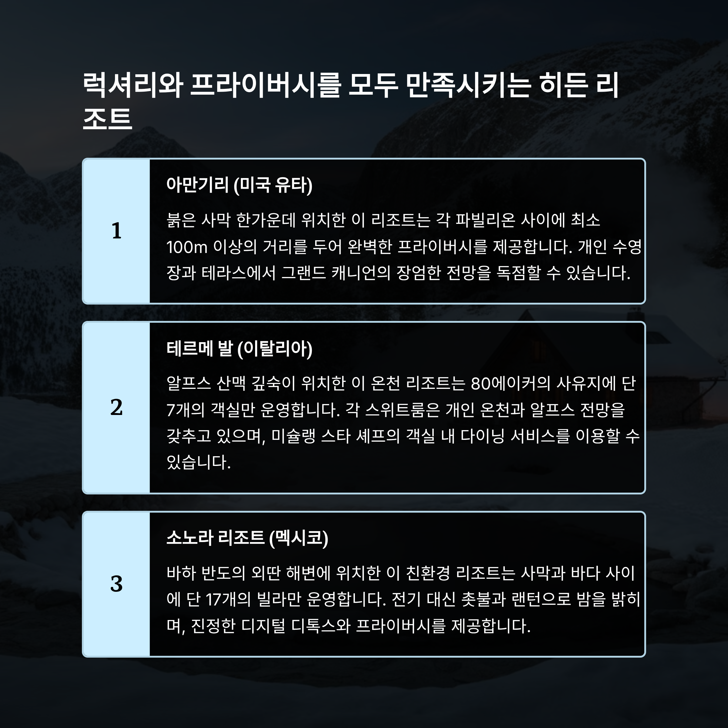 이 리조트들은 단순히 프라이버시만 좋은 게 아니라, 내부 인테리어나 부대시설, 레스토랑까지도 매우 고급스러워요. 신혼여행이나 특별한 기념일에 딱이에요. 고요한 자연 속에서 고급스러움을 누리고 싶다면 이 섹션의 리조트들을 참고해보세요! 🌺