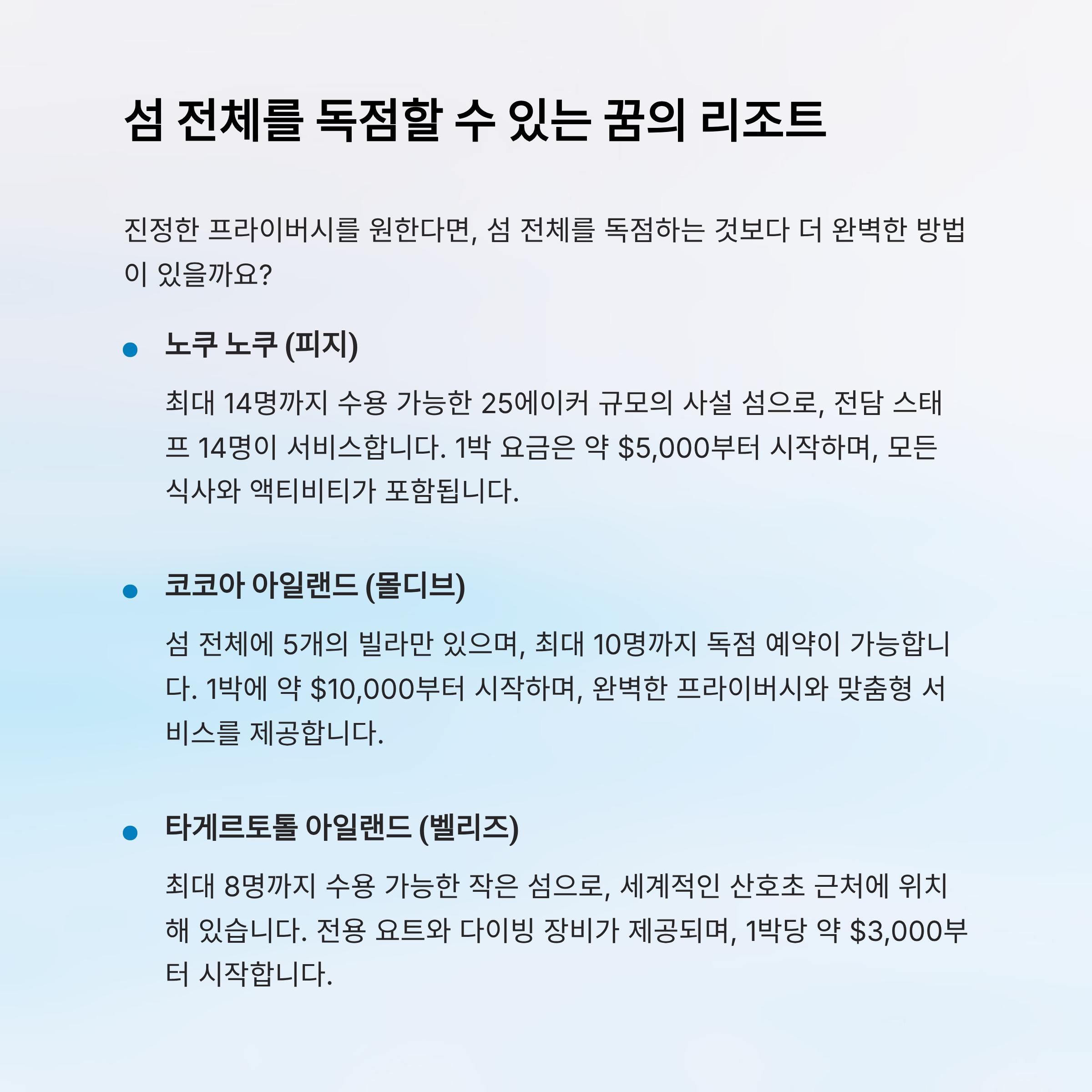 이런 섬 독점형 리조트는 가격도 고급 그 자체예요. 1박에 최소 수천만 원부터 시작되지만, 프라이버시와 맞춤형 서비스가 최고 수준이라 영화배우, 재벌, 로열패밀리들이 자주 찾는 이유도 충분해요.