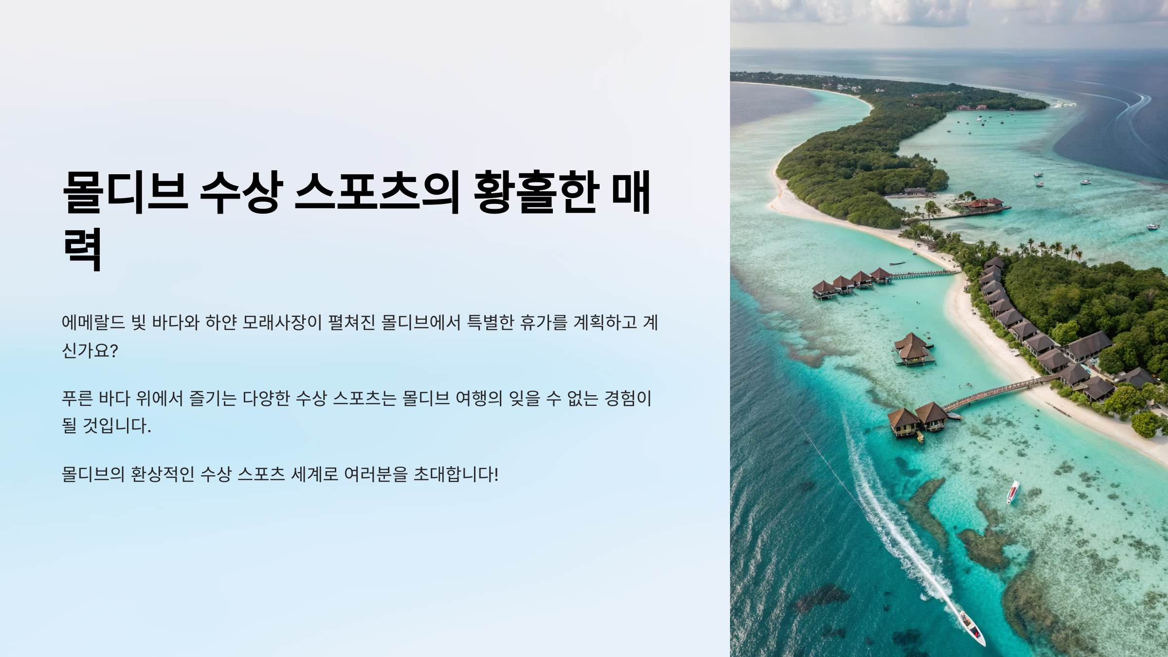 몰디브의 눈부신 에메랄드빛 바다는 바라보는 것만으로도 힐링이지만, 그 속으로 직접 뛰어들어 즐기는 수상 스포츠는 여행의 즐거움을 배가시켜줘요. 잔잔한 라군부터 역동적인 파도까지, 몰디브는 다양한 수상 스포츠를 즐기기에 완벽한 환경을 갖추고 있죠. 상상만 해도 가슴 뛰는 몰디브에서의 수상 액티비티, 지금부터 자세히 알아볼까요? 🐠🛶