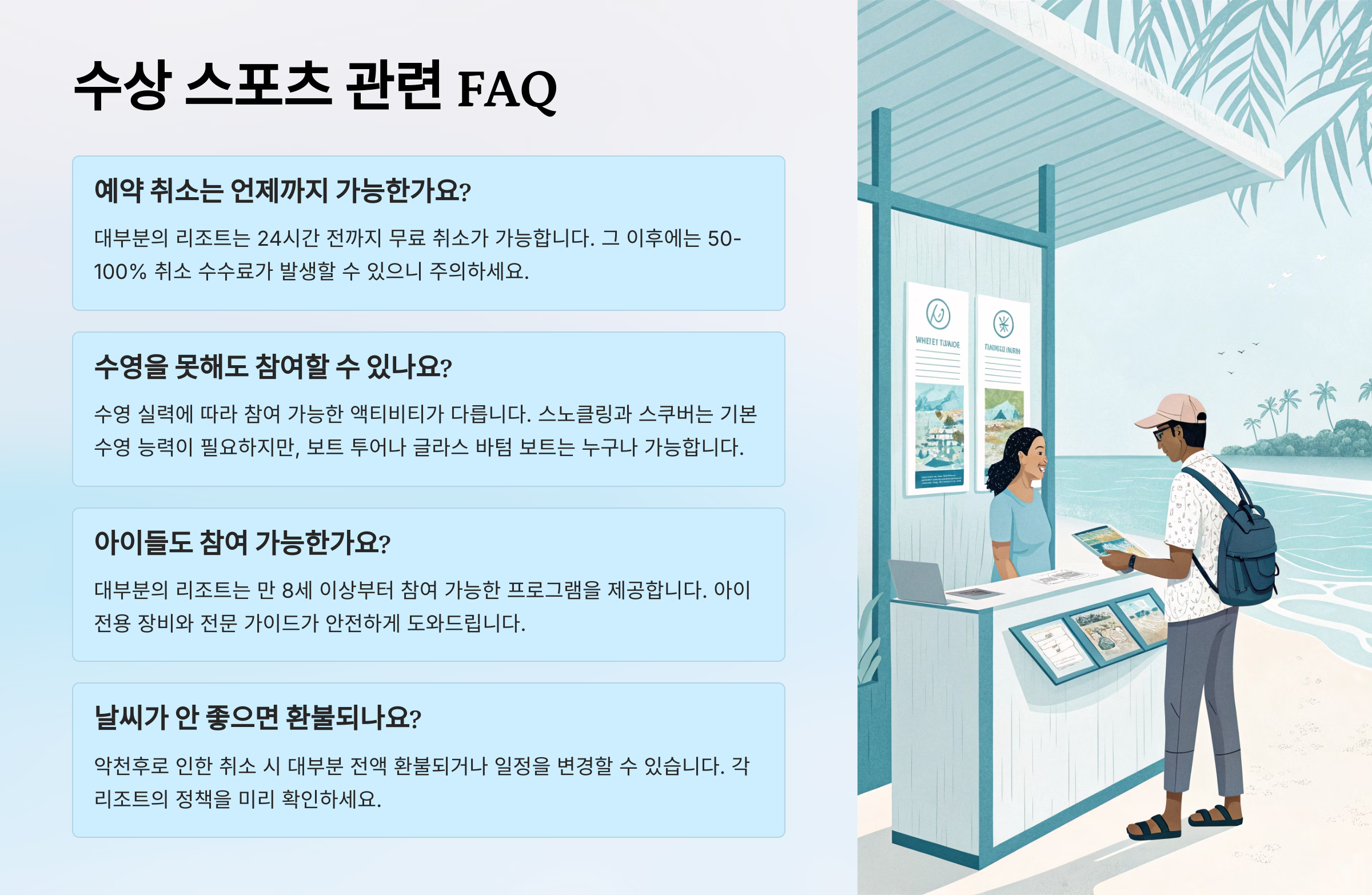 | 예약 시 | 포함 사항 확인, 날씨 예보 체크, 예약 시간 엄수 |
