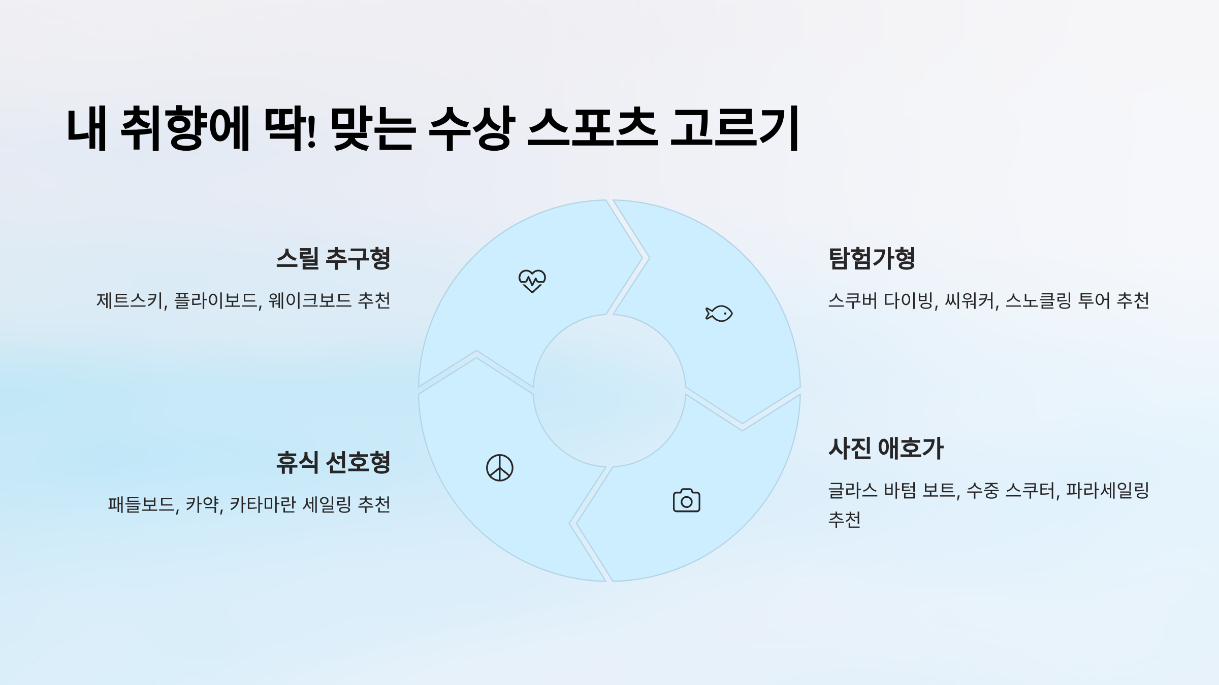 | 힐링 & 여유 추구형 | 카약, 패들보드, 선셋 세일링 | 고요한 바다 감상, 평화로운 시간 |