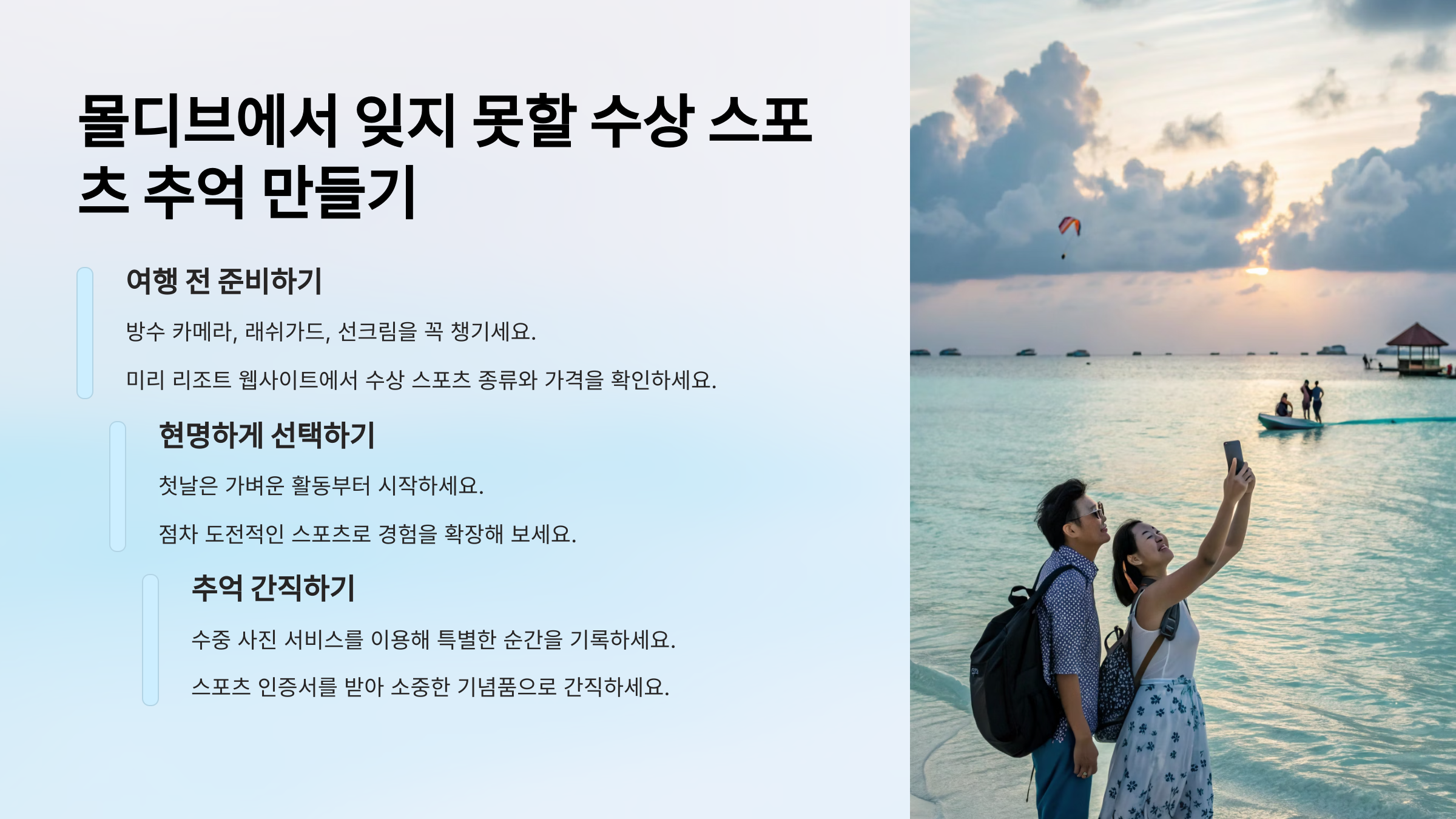 이런 기본적인 사항들만 잘 지켜도 몰디브에서의 수상 스포츠는 평생 잊지 못할 즐거운 추억으로 가득할 거예요. 안전하게, 그리고 신나게 몰디브 바다를 누벼보세요! 🤙🌞