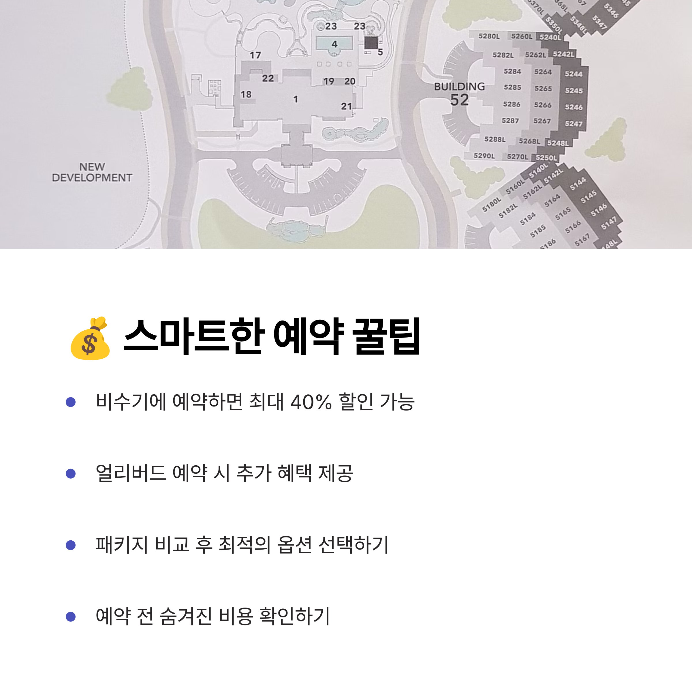 | 일찍 예약 | 성수기/인기 리조트는 6개월~1년 전 | 얼리버드 할인, 원하는 플랜 확보 |