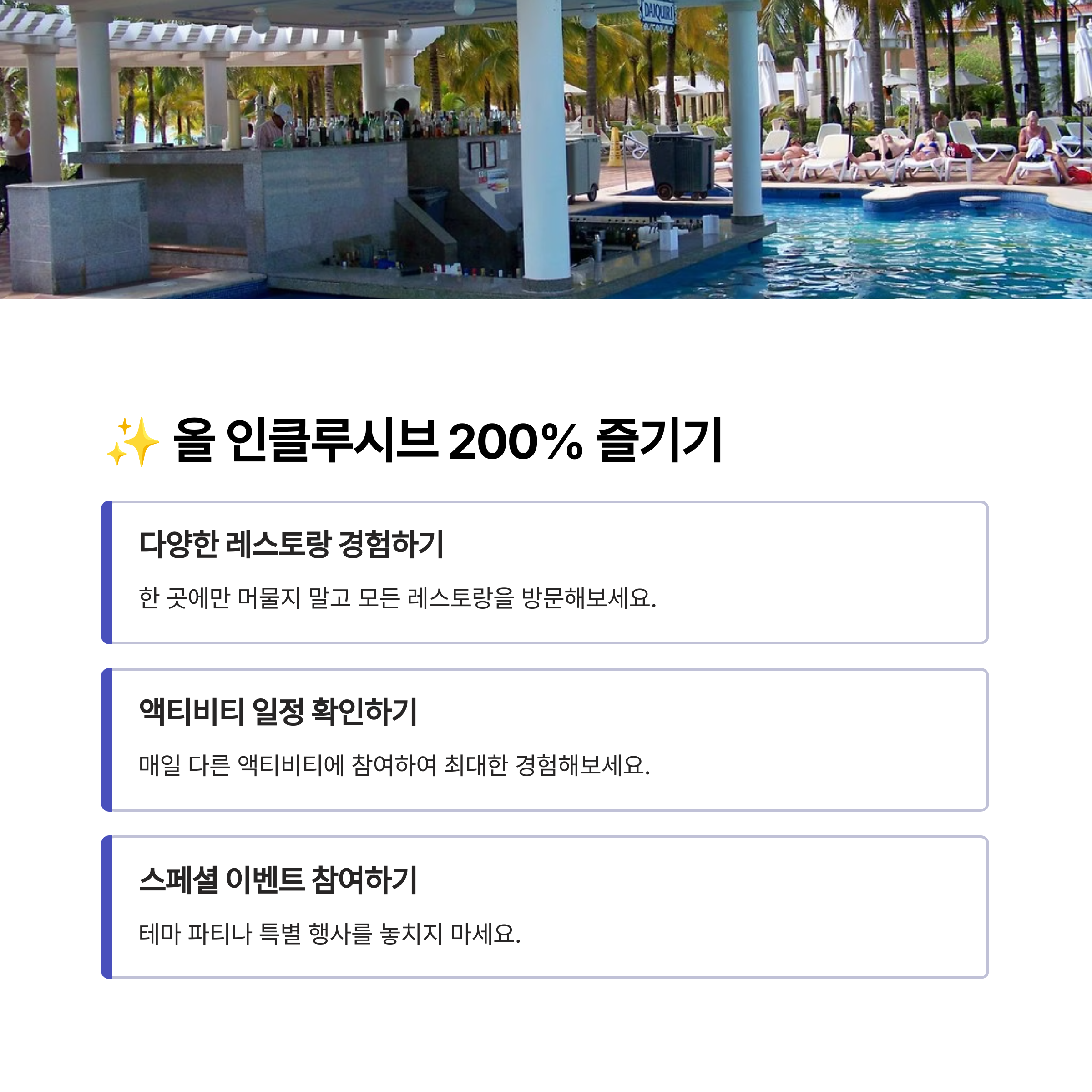2. 올 인클루시브 패키지 상세 비교: '24시간'의 의미: 24시간 제공되는 식음료가 특정 바에서만 가능한지, 아니면 룸서비스까지 포함되는지 확인하세요. 포함되는 주류/음식 브랜드: 프리미엄 올 인클루시브라면 어떤 등급의 주류와 음식을 제공하는지 확인하세요. 포함 액티비티: 어떤 수상 스포츠나 익스커션이 무료로 제공되는지 횟수와 종류를 꼼꼼히 확인하세요.
