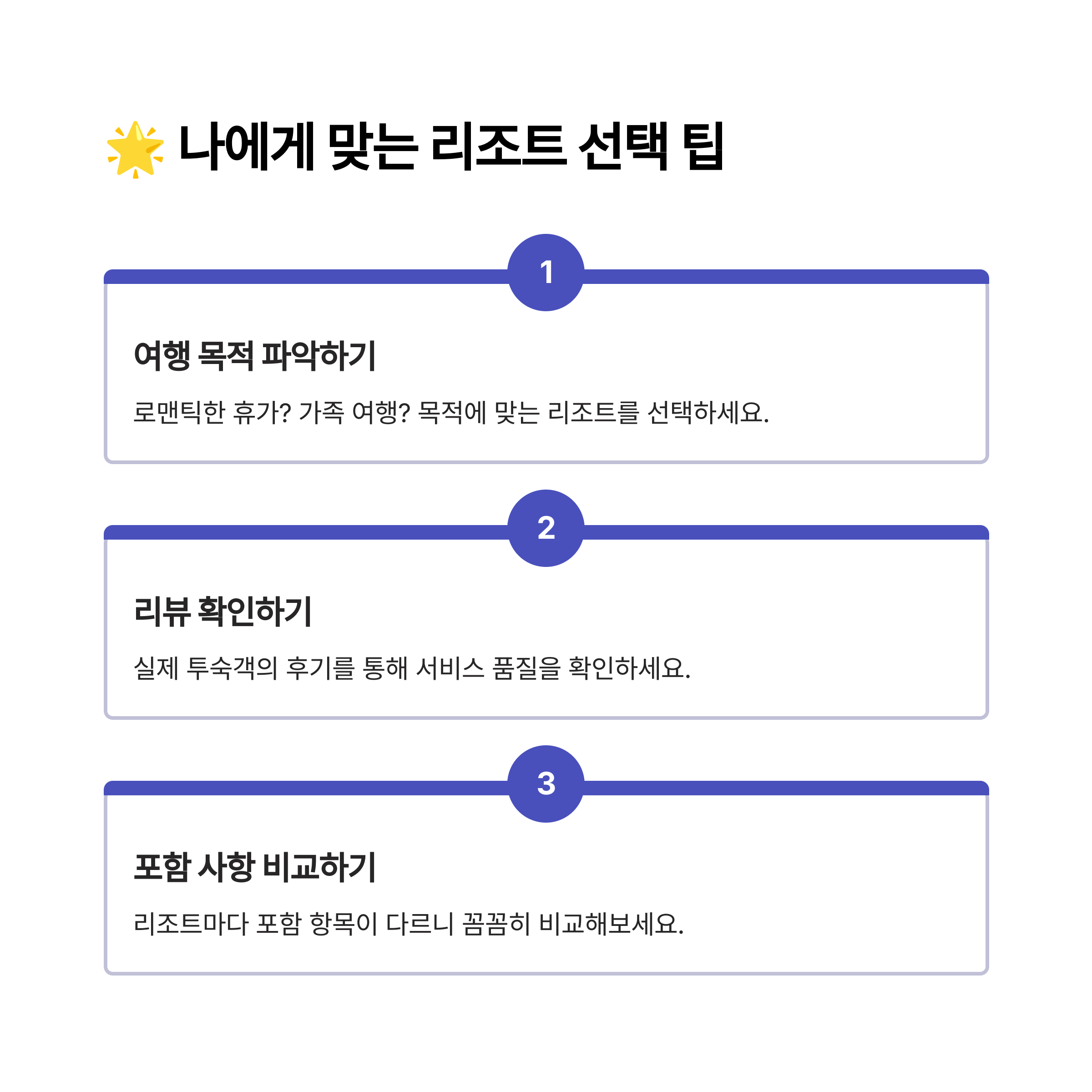 | 여행 목적 | 허니문, 가족, 액티비티, 힐링 등 | 목적에 맞는 리조트 분위기/시설 선택 |