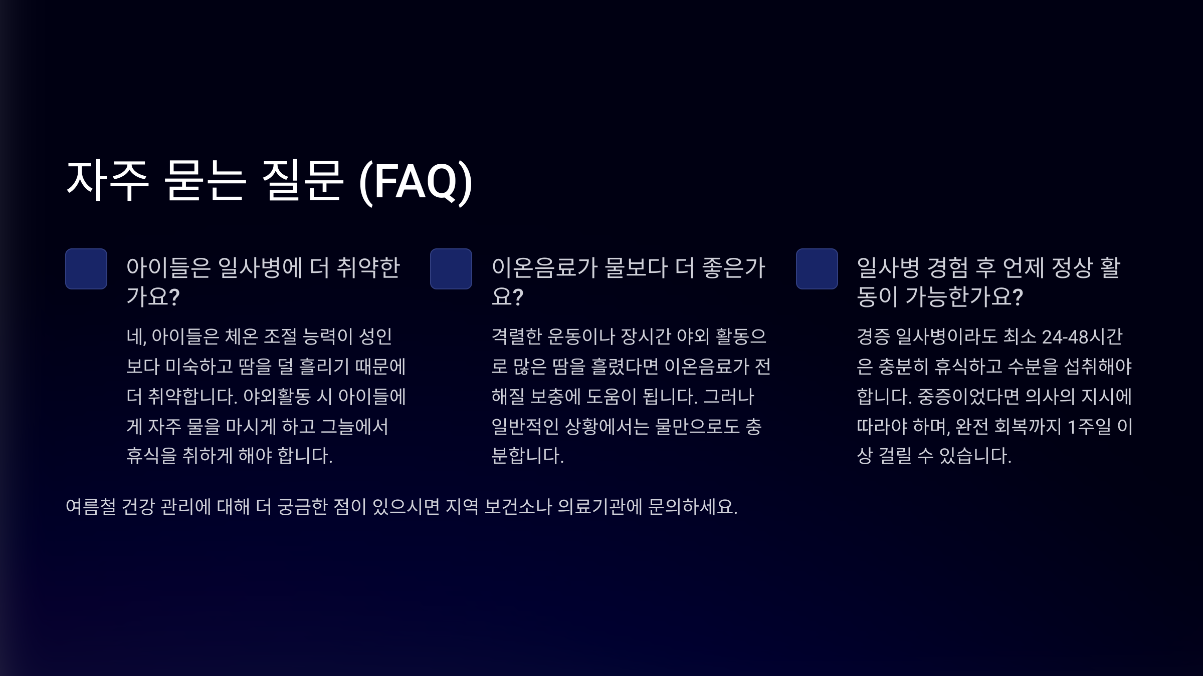 | 피로감 / 무기력 | 몸이 보내는 경고 신호 | 충분한 수분 섭취 |