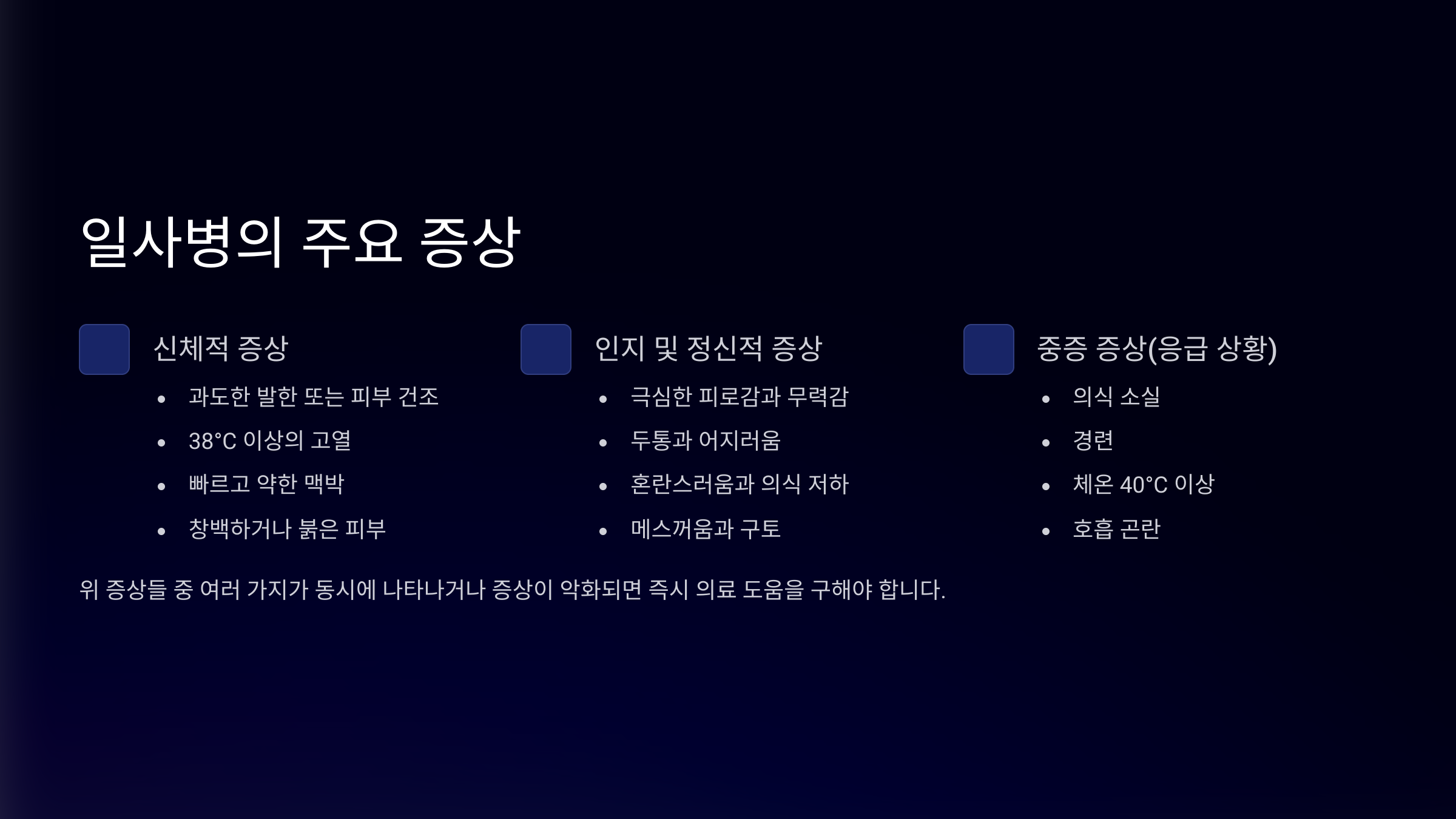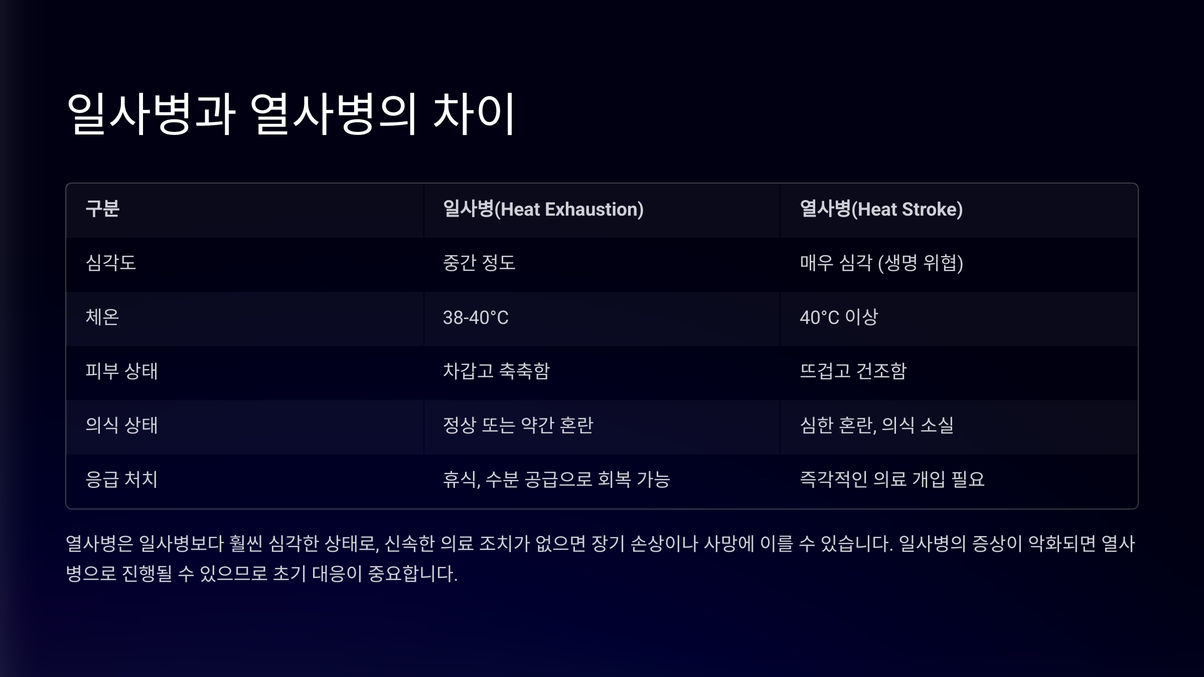 | 구분 | 일사병 (Heat Exhaustion) | 열사병 (Heat Stroke) |