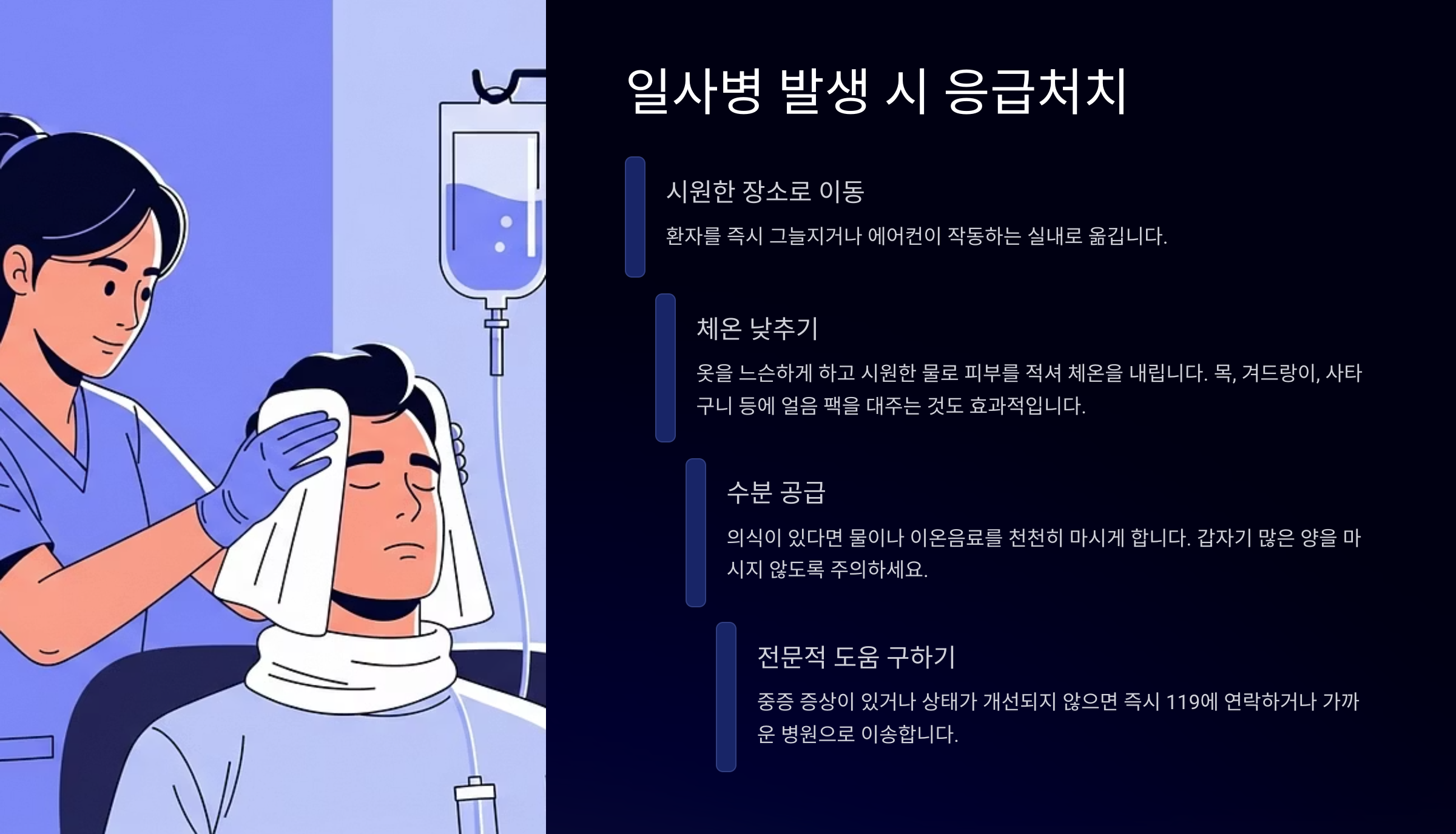 만약 주변에서 일사병 증상을 보이는 사람을 발견하거나, 자신이 증상을 느낀다면 즉시 응급처치에 돌입해야 합니다. 초기 대처가 환자의 상태를 좌우할 수 있어요.